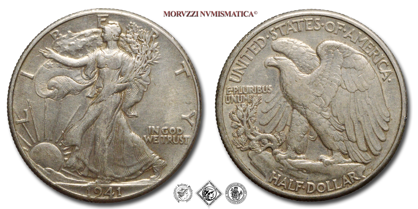 Stati Uniti d'America, USA, DOLLARO 1/2, Walking Liberty, Emissione: 1941, D/ LIBERTY, Libertà andante a sinistra; sotto: data (1941); nel campo, a destra: IN GOD / WE TRUST. Incisore: Adolph Alexander Weinman, R/ UNITED·STATES·oF·AMERICA, Aquila ad ali spiegate; sotto: valore (HALF·DOLLAR) e inziali dell'incisore (AAW per Adolph Alexander Weinman); nel campo, a sinistra: E·PLURIBUS / UNUM, Zecca di Philadelphia, Rif. bibl. KM, 142; Metallo: AR, gr. 12,45, (ME154900), Diam.: mm. 30,49, BB