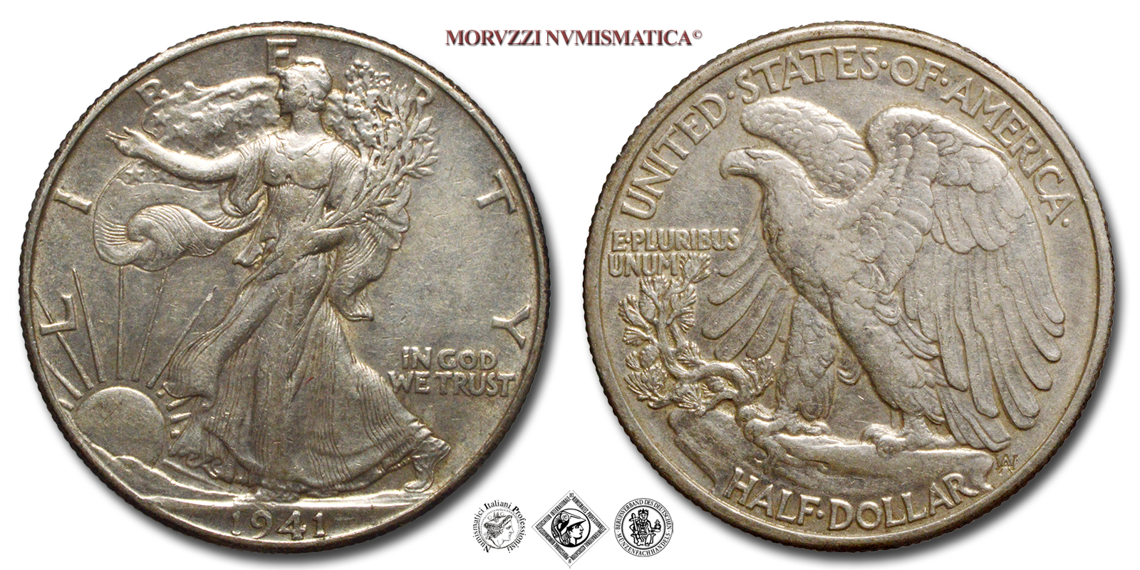 Stati Uniti d'America, USA, DOLLARO 1/2, Walking Liberty, Emissione: 1941, D/ LIBERTY, Libertà andante a sinistra; sotto: data (1941); nel campo, a destra: IN GOD / WE TRUST. Incisore: Adolph Alexander Weinman, R/ UNITED·STATES·oF·AMERICA, Aquila ad ali spiegate; sotto: valore (HALF·DOLLAR) e inziali dell'incisore (AAW per Adolph Alexander Weinman); nel campo, a sinistra: E·PLURIBUS / UNUM, Zecca di Philadelphia, Rif. bibl. KM, 142; Metallo: AR, gr. 12,41, (ME154902), Diam.: mm. 30,48, BB