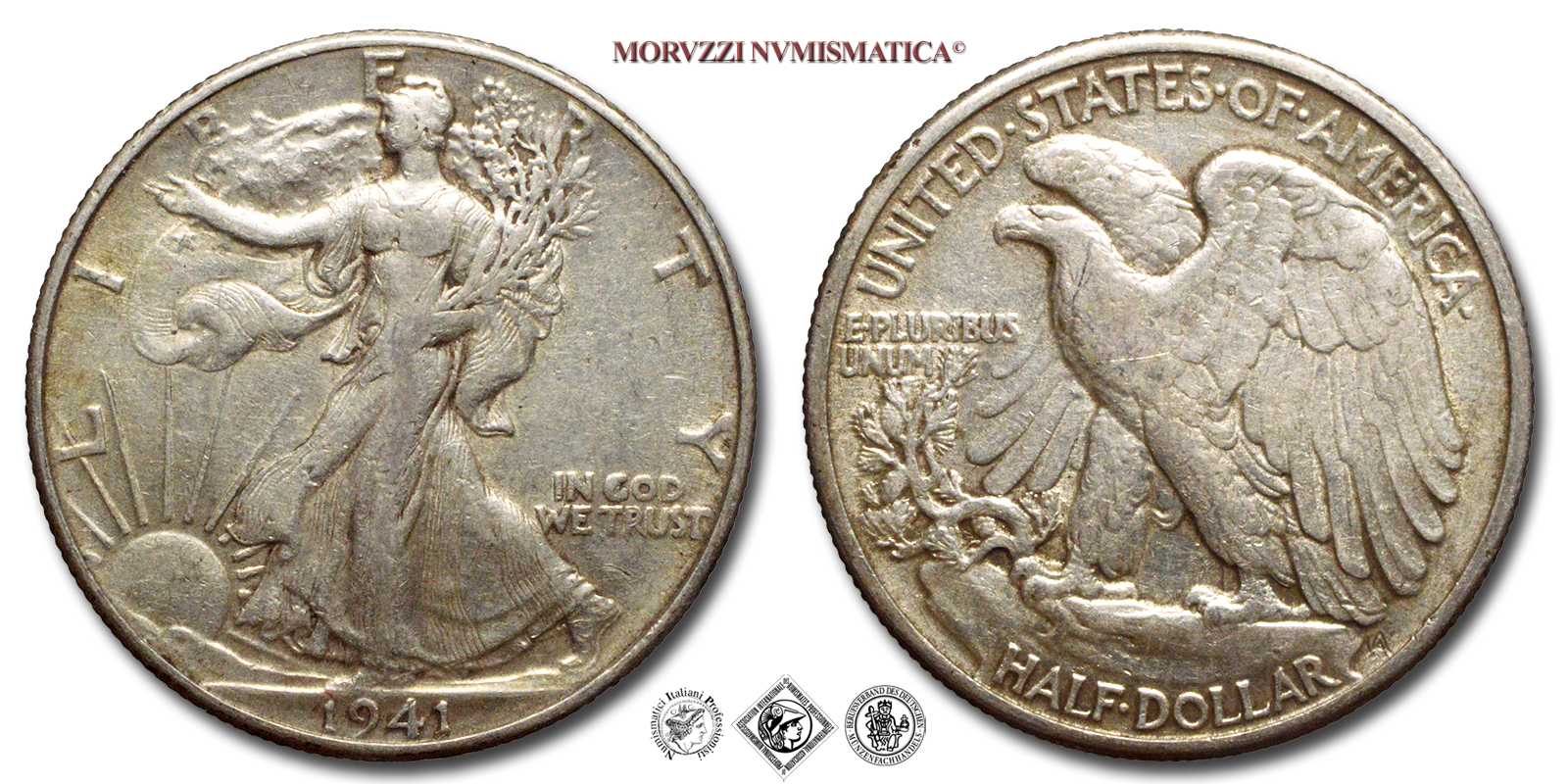 Stati Uniti d'America, USA, DOLLARO 1/2, Walking Liberty, Emissione: 1941, D/ LIBERTY, Libertà andante a sinistra; sotto: data (1941); nel campo, a destra: IN GOD / WE TRUST. Incisore: Adolph Alexander Weinman, R/ UNITED·STATES·oF·AMERICA, Aquila ad ali spiegate; sotto: valore (HALF·DOLLAR) e inziali dell'incisore (AAW per Adolph Alexander Weinman); nel campo, a sinistra: E·PLURIBUS / UNUM, Zecca di Philadelphia, Rif. bibl. KM, 142; Metallo: AR, gr. 12,44, (ME154913), Diam.: mm. 30,46, BB