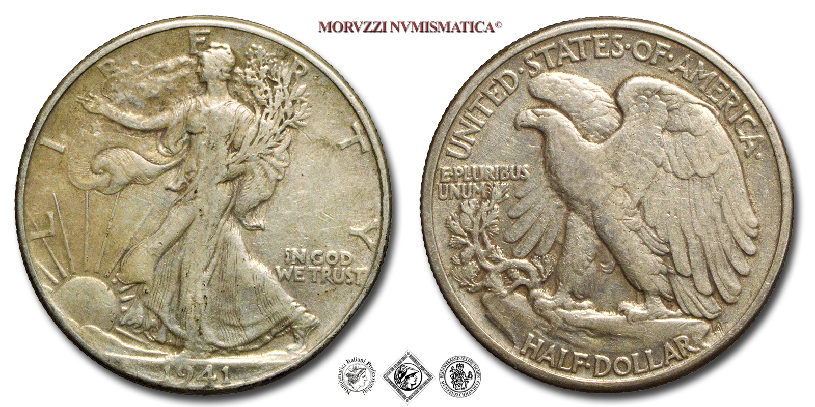 Stati Uniti d'America, USA, DOLLARO 1/2, Walking Liberty, Emissione: 1941, D/ LIBERTY, Libertà andante a sinistra; sotto: data (1941); nel campo, a destra: IN GOD / WE TRUST. Incisore: Adolph Alexander Weinman, R/ UNITED·STATES·oF·AMERICA, Aquila ad ali spiegate; sotto: valore (HALF·DOLLAR) e inziali dell'incisore (AAW per Adolph Alexander Weinman); nel campo, a sinistra: E·PLURIBUS / UNUM, Zecca di Philadelphia, Rif. bibl. KM, 142; Metallo: AR, gr. 12,35, (ME154873), Diam.: mm. 30,47, BB