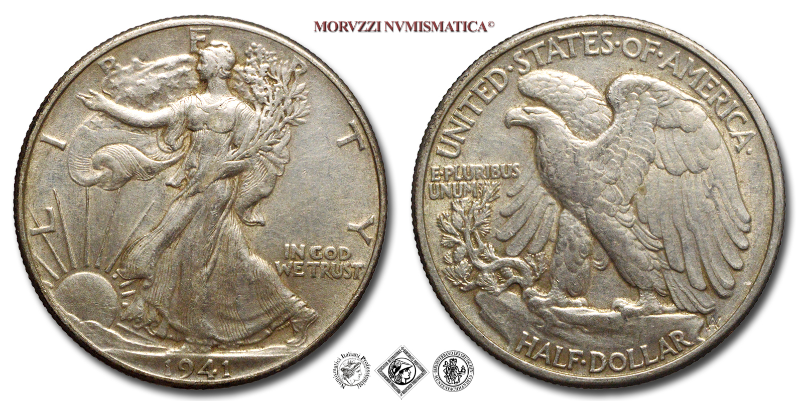 Stati Uniti d'America, USA, DOLLARO 1/2, Walking Liberty, Emissione: 1941, D/ LIBERTY, Libertà andante a sinistra; sotto: data (1941); nel campo, a destra: IN GOD / WE TRUST. Incisore: Adolph Alexander Weinman, R/ UNITED·STATES·oF·AMERICA, Aquila ad ali spiegate; sotto: valore (HALF·DOLLAR) e inziali dell'incisore (AAW per Adolph Alexander Weinman); nel campo, a sinistra: E·PLURIBUS / UNUM, Zecca di Philadelphia, Rif. bibl. KM, 142; Metallo: AR, gr. 12,45, (ME154899), Diam.: mm. 30,46, BB