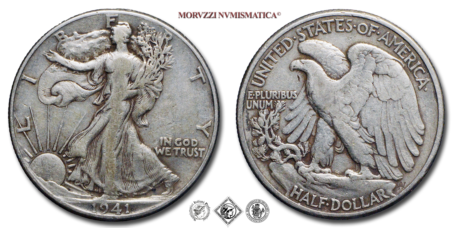 Stati Uniti d'America, USA, DOLLARO 1/2, Walking Liberty, Emissione: 1941, D/ LIBERTY, Libertà andante a sinistra; sotto: data (1941); nel campo, a destra: IN GOD / WE TRUST. Incisore: Adolph Alexander Weinman, R/ UNITED·STATES·oF·AMERICA, Aquila ad ali spiegate; sotto: valore (HALF·DOLLAR) e inziali dell'incisore (AAW per Adolph Alexander Weinman); nel campo, a sinistra: E·PLURIBUS / UNUM, Zecca di Philadelphia, Rif. bibl. KM, 142; Metallo: AR, gr. 12,44, (ME154877), Diam.: mm. 30,44, qBB