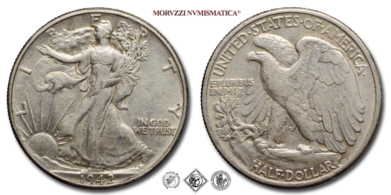 Stati Uniti d'America, USA, DOLLARO 1/2, Walking Liberty, Emissione: 1942, D/ LIBERTY, Libertà andante a sinistra; sotto: data (1942); nel campo, a destra: IN GOD / WE TRUST. Incisore: Adolph Alexander Weinman, R/ UNITED·STATES·oF·AMERICA, Aquila ad ali spiegate; sotto: valore (HALF·DOLLAR) e inziali dell'incisore (AAW per Adolph Alexander Weinman); nel campo, a sinistra: E·PLURIBUS / UNUM, Zecca di Philadelphia, Rif. bibl. KM, 142; Metallo: AR, gr. 12,55, (ME154920), Diam.: mm. 30,49, BB