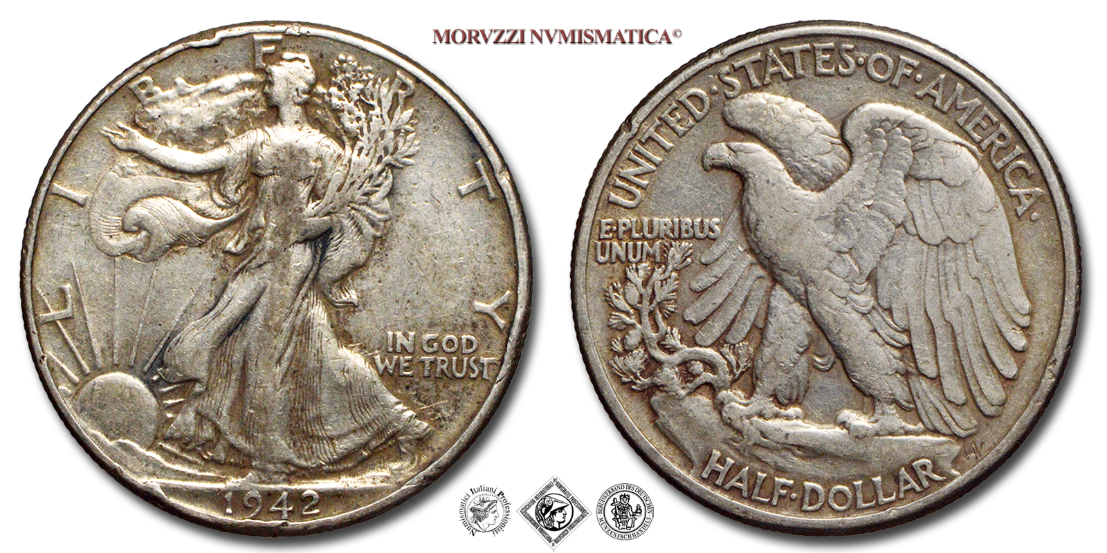 Stati Uniti d'America, USA, DOLLARO 1/2, Walking Liberty, Emissione: 1942, D/ LIBERTY, Libertà andante a sinistra; sotto: data (1942); nel campo, a destra: IN GOD / WE TRUST. Incisore: Adolph Alexander Weinman, R/ UNITED·STATES·oF·AMERICA, Aquila ad ali spiegate; sotto: valore (HALF·DOLLAR) e inziali dell'incisore (AAW per Adolph Alexander Weinman); nel campo, a sinistra: E·PLURIBUS / UNUM, Zecca di Philadelphia, Rif. bibl. KM, 142; Metallo: AR, gr. 12,53, (ME154870), Diam.: mm. 30,50, qBB