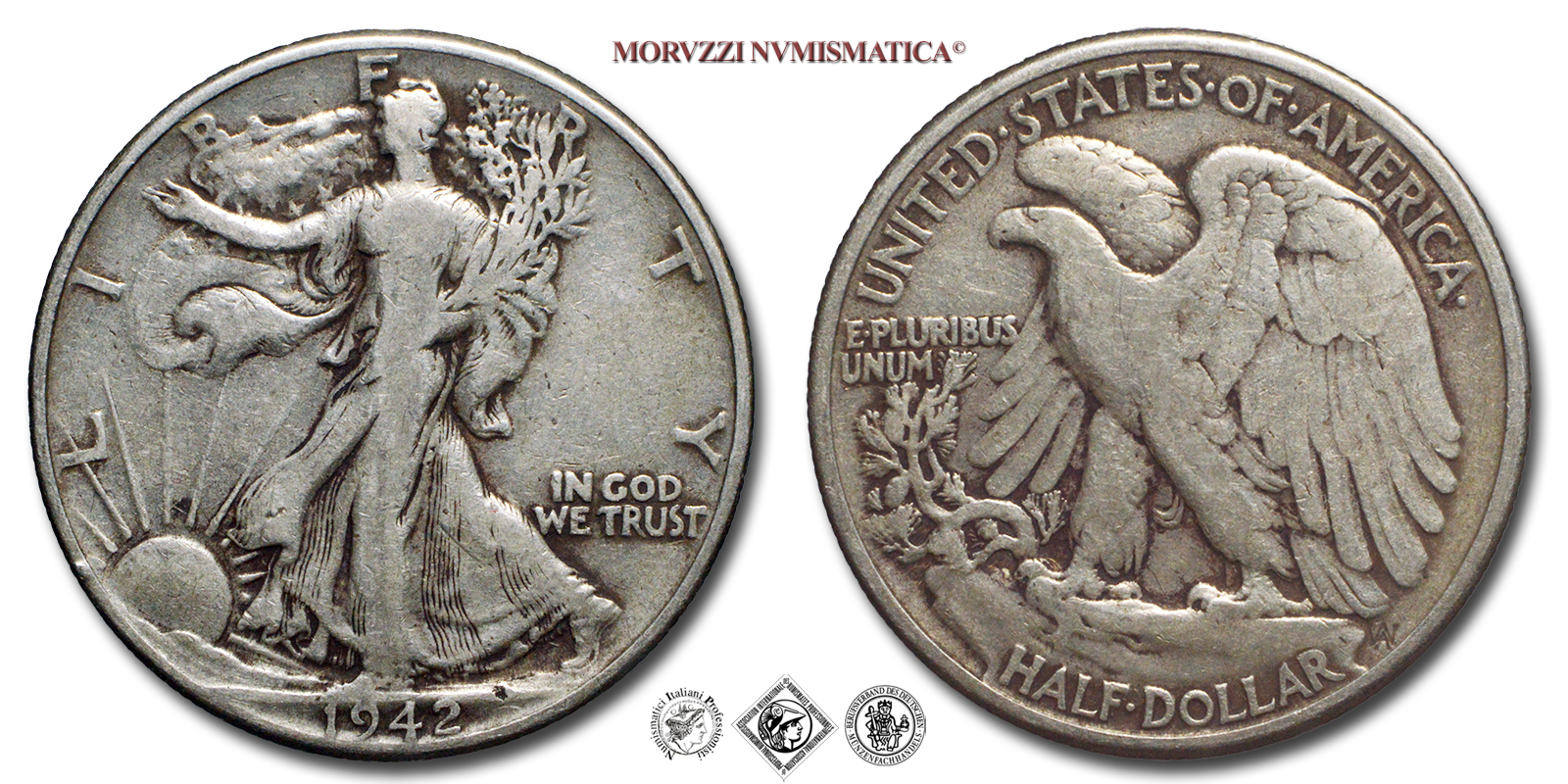 Stati Uniti d'America, USA, DOLLARO 1/2, Walking Liberty, Emissione: 1942, D/ LIBERTY, Libertà andante a sinistra; sotto: data (1942); nel campo, a destra: IN GOD / WE TRUST. Incisore: Adolph Alexander Weinman, R/ UNITED·STATES·oF·AMERICA, Aquila ad ali spiegate; sotto: valore (HALF·DOLLAR) e inziali dell'incisore (AAW per Adolph Alexander Weinman); nel campo, a sinistra: E·PLURIBUS / UNUM, Zecca di Philadelphia, Rif. bibl. KM, 142; Metallo: AR, gr. 12,41, (ME154869), Diam.: mm. 30,47, qBB