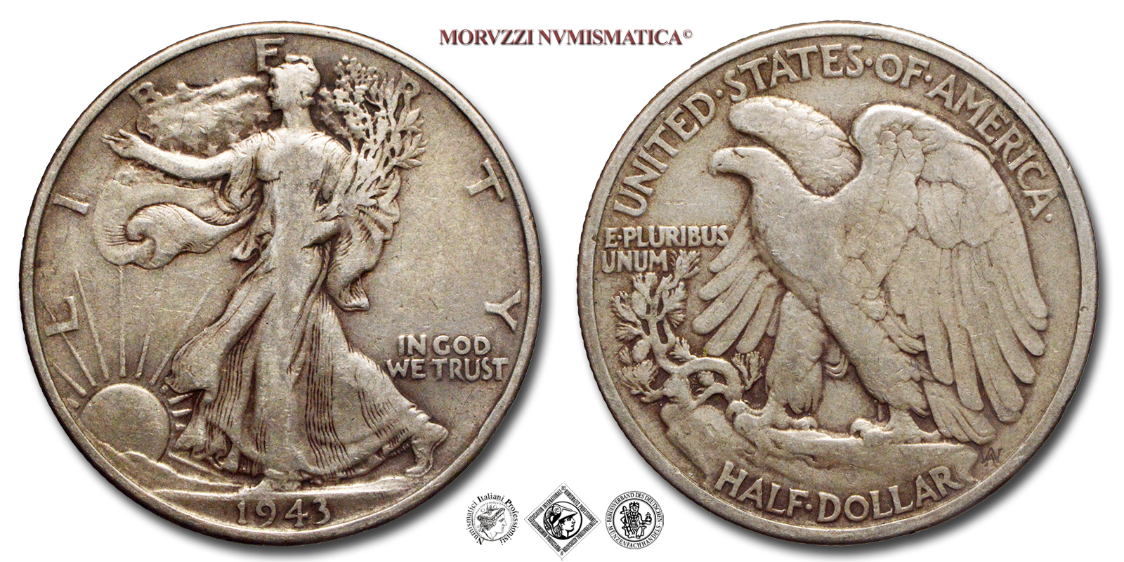 Stati Uniti d'America, USA, DOLLARO 1/2, Walking Liberty, Emissione: 1943, D/ LIBERTY, Libertà andante a sinistra; sotto: data (1943); nel campo, a destra: IN GOD / WE TRUST. Incisore: Adolph Alexander Weinman, R/ UNITED·STATES·oF·AMERICA, Aquila ad ali spiegate; sotto: valore (HALF·DOLLAR) e inziali dell'incisore (AAW per Adolph Alexander Weinman); nel campo, a sinistra: E·PLURIBUS / UNUM, Zecca di Philadelphia, Rif. bibl. KM, 142; Metallo: AR, gr. 12,37, (ME154921), Diam.: mm. 30,38, BB