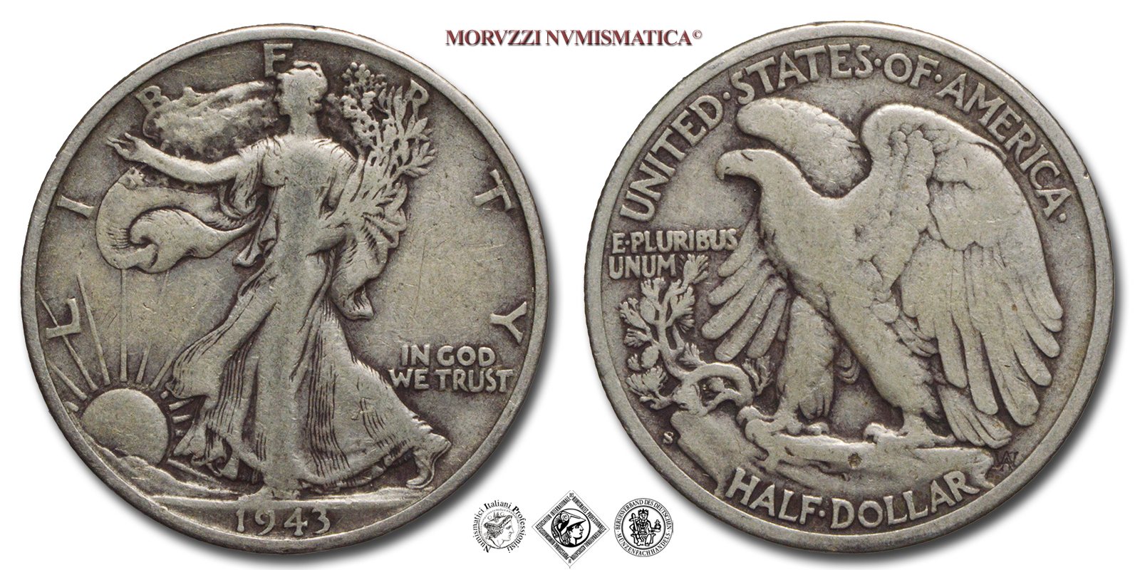 Stati Uniti d'America, USA, DOLLARO 1/2, Walking Liberty, Emissione: 1943, D/ LIBERTY, Libertà andante a sinistra; sotto: data (1943); nel campo, a destra: IN GOD / WE TRUST. Incisore: Adolph Alexander Weinman, R/ UNITED·STATES·oF·AMERICA, Aquila ad ali spiegate; sotto: valore (HALF·DOLLAR) e inziali dell'incisore (AAW per Adolph Alexander Weinman); nel campo, a sinistra: E·PLURIBUS / UNUM, Zecca di Philadelphia, Rif. bibl. KM, 142; Metallo: AR, gr. 12,20, (ME161124), Diam.: mm. 30,47, qBB