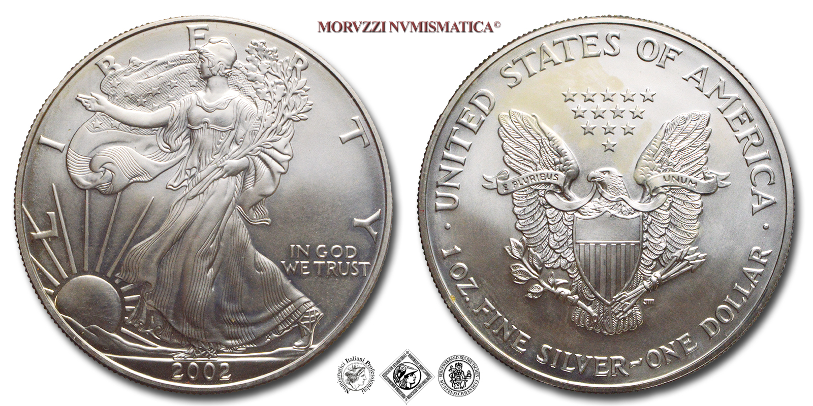 Stati Uniti, USA, DOLLARO, American Eagle, Emissione: 2002, D/ LIBERTY, Libertà andante a sinistra; nel campo, a destra: il motto (IN GOD WE TRUST); in esergo: la data (2002). Incisore: Adolph Alexander Weinman, R/ · UNITED STATES OF AMERICA ·, aquila araldica con scudo, impugna nell'artiglio destro un ramoscello d'ulivo e nell'artiglio sinistro delle frecce; il motto: E PLURIBUS UNUM; nel campo, a destra, sotto le frecce: la sigla dell'incisore (JM per John M. Mercanti); in basso, lungo il bordo: 1 OZ. FINE SILVER~ONE DOLLAR, Zecca di Philadelphia, Rif. bibl. KM, 273; Metallo: AR, gr. 31,39, (ME162904), Diam.: mm. 40,54, FDC