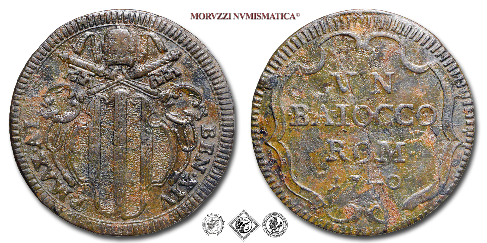 Stato Pontificio, BENEDETTO XIV, Lambertini, 1740-1758, BAIOCCO, Emissione: 1740, D/ BEN • XIV - P • MAX • A • I, stemma quadrilobato, chiavi con impugnatura a due centine con cordoni e fiocchi, R/ VN // BAIOCCO // ROM • // 1740, in ghirlanda destrorsa di foglie lunghe binate, Zecca di Roma, Rif. bibl. Muntoni, 161; C.N.I., 19; Metallo: CU, gr. 10,85, (MX152343), Diam.: mm. 33,91, qBB