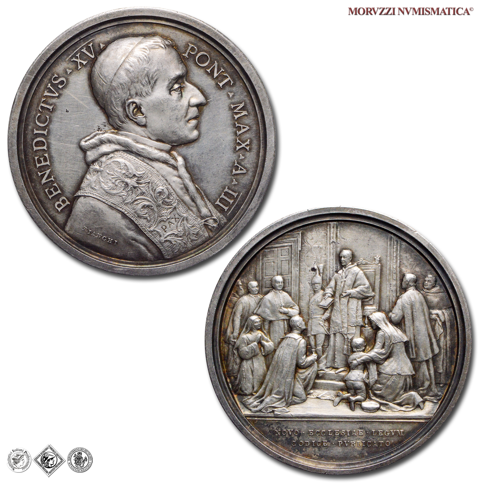 Stato Pontificio, BENEDETTO XV, Della Chiesa, 1914-1922, MEDAGLIA, Promulgazione del Codice di Diritto Canonico, Emissione: 1917 A III, D/ BENEDICTVS • XV • PONT • MAX • A • III , busto con berretto, mozzetta e stola a d.; sotto: BIANCHI, R/ il Papa stante dinanzi al trono, a s. una guardia nobile e intorno vari prelati, una suora ed una madre con bambino; in esergo: NOVO • ECCLESIA • LEGVM / CODICE • PVBLICATO, Opus Francesco Bianchi, Rif. bibl. Bart., E917; Metallo: AR, gr. 38,69, (MP132263), Diam.: mm. 43,82, FDC, (NC)
