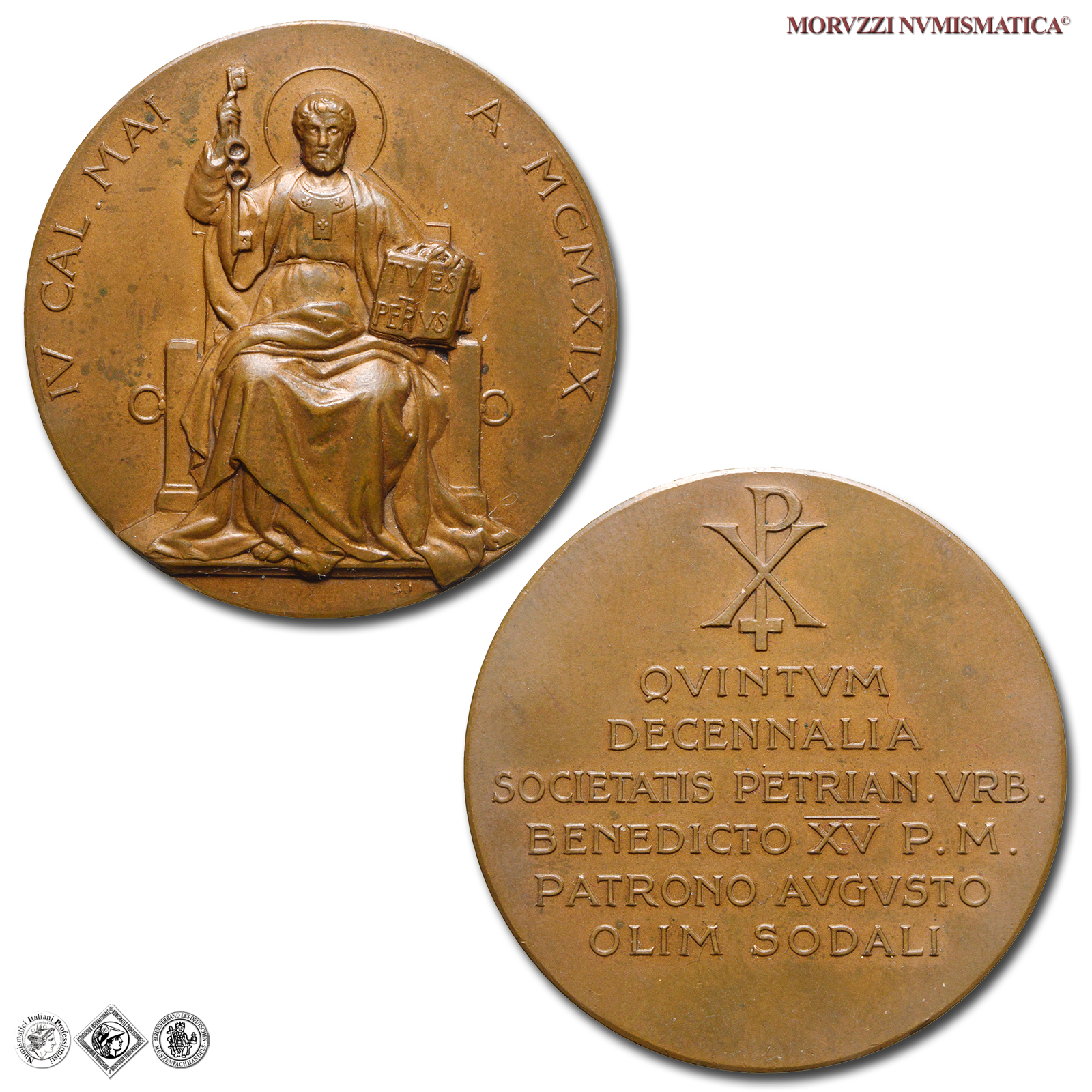 Santa Sede, BENEDETTO XV, Della Chiesa, 1914-1922, MEDAGLIA STRAORDINARIA ARGENTATA, 50° Circolo San Pietro, Emissione: 1919, D/ IV CAL. MAI _ A. MCMXIX, S. Pietro in trono, nimbato, di fronte, regge chiavi e vangelo; in esergo, a sinistra: S.J., R/ nel campo: PX / QVINTVM / DECENNALIA / SOCIETATIS PETRIAN. VRB. / BENEDICTO XV P. M. / PATRONO AVGVSTO / OLIM SODALI, Opus Stefano Johnson, Rif. bibl. CM, 184; Metallo: AE, gr. 24,97, (MP55145), Diam.: mm. 38,25, FDC, (R)