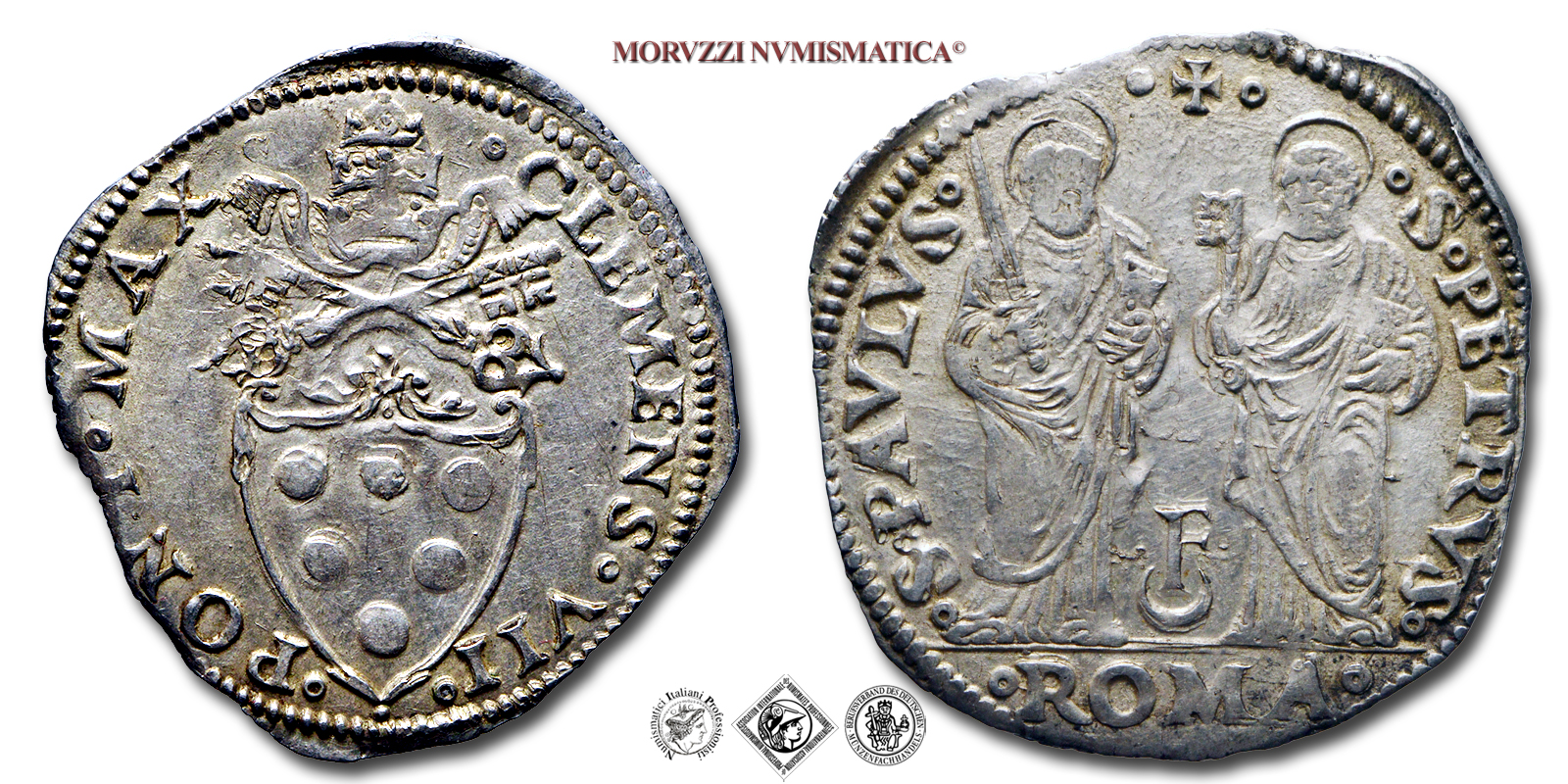 Emissione: 1524-1534, Zecca di Roma, Rif. bibl. Muntoni, 54; C.N.I., 99; Metallo: AR, gr. 3,80, (MX157404), Diam.: mm. 28,77, SPL, (RR)