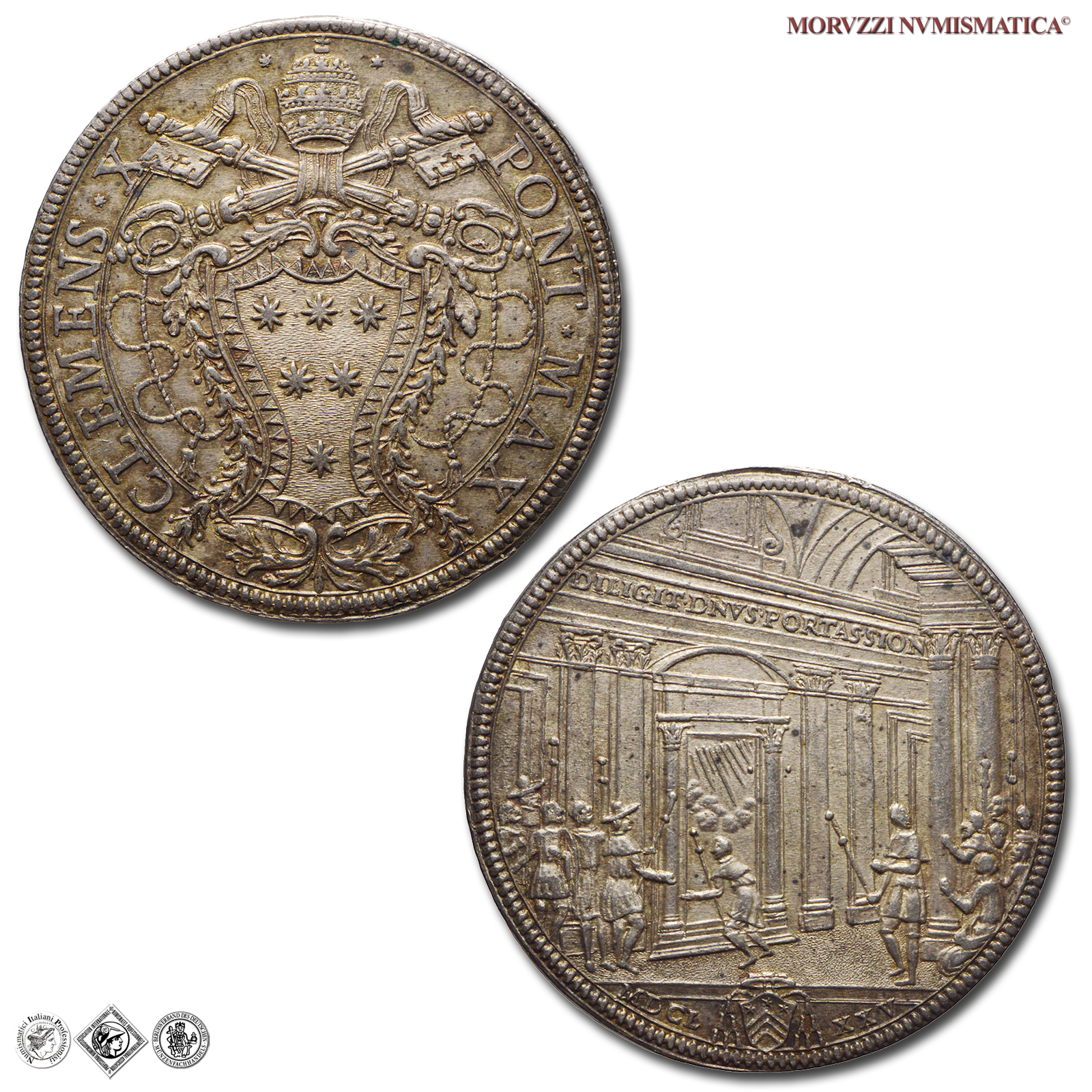 Stato Pontificio, CLEMENTE X, Altieri, PIASTRA, Piastra del Giubileo, Emissione: 1675, D/ CLEMENS * X – PONT * MAX, stemma sormontato da triregno e chiavi decussate, R/ DILIGIT • DNS • PORTAS • SION, pellegrini davanti la Porta Santa; in esergo: MDCL (armetta Costaguti) XXV, Zecca di Roma, Girloamo Lucenti, Rif. bibl. Muntoni, 18; Berman, 2007; Metallo: AR, gr. 32,07, (MX158257), Diam.: mm. 43,95, qFDC, (R)