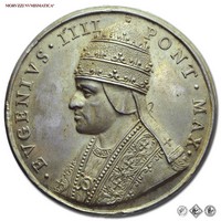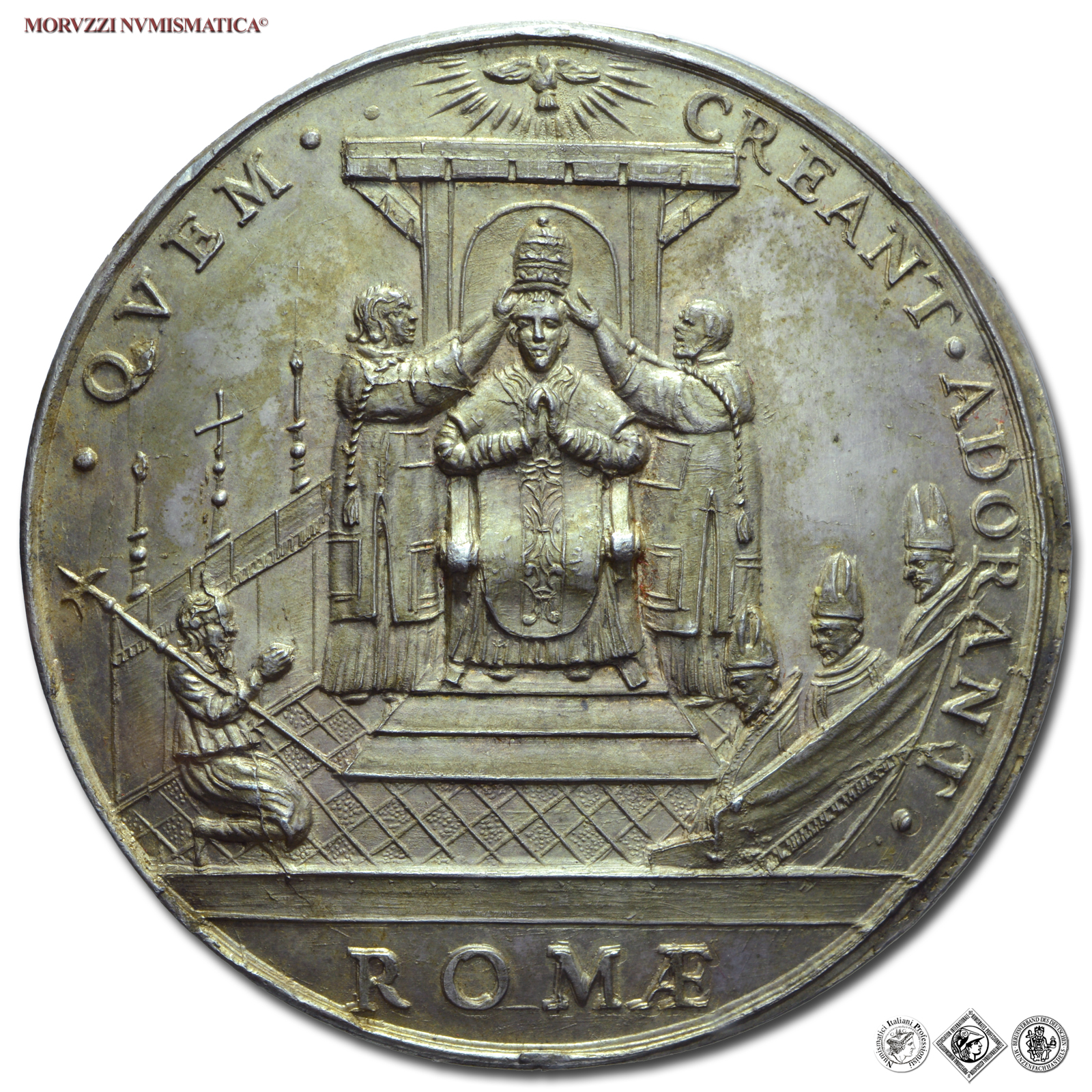 Stato Pontificio, EUGENIO IV, Condulmer, 1431-1447, MEDAGLIA DI RESTITUZIONE IN ARGENTO, Incoronazione, Emissione: 1664, D/ • EVGENIVS • IIII PONT • MAX •, busto a sinistra con piviale arabescato, R/ • QVEM • CREANT • ADORAVIT •, il Pontefice in trono tra due cardinali, che lo stanno incoronando col triregno; a sinistra, figura inginocchiata, a destra tre prelati in tribuna, sopra la colomba dello Spirito Santo raggiante; in esergo: ROMAE, Opus Girolamo Paladino, Rif. bibl. Modesti CNORP I, 18; Armand I, 295; Metallo: AR, gr. 40,02, (MP147430), qFDC, (RR)