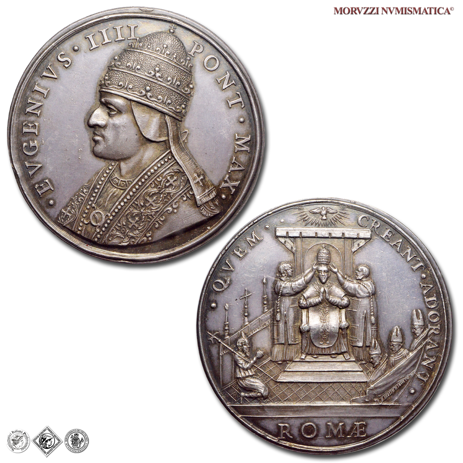 Stato Pontificio, EUGENIO IV, Condulmer, 1431-1447, MEDAGLIA, Incoronazione, Emissione: 1664, D/ • EVGENIVS • IIII PONT • MAX •, busto a sinistra con piviale arabescato, R/ • QVEM • CREANT • ADORAVIT •, il Pontefice in trono tra due cardinali, che lo stanno incoronando col triregno; a sinistra, figura inginocchiata, a destra tre prelati in tribuna, sopra la colomba dello Spirito Santo raggiante; in esergo: ROMAE, Opus Girolamo Paladino, Rif. bibl. Modesti CNORP I, 18;  Mazio e RZ, 5; Armand I, 295; Metallo: AR, gr. 37,42, (MP160402), Diam.: mm. 42,97, qFDC, (RR)