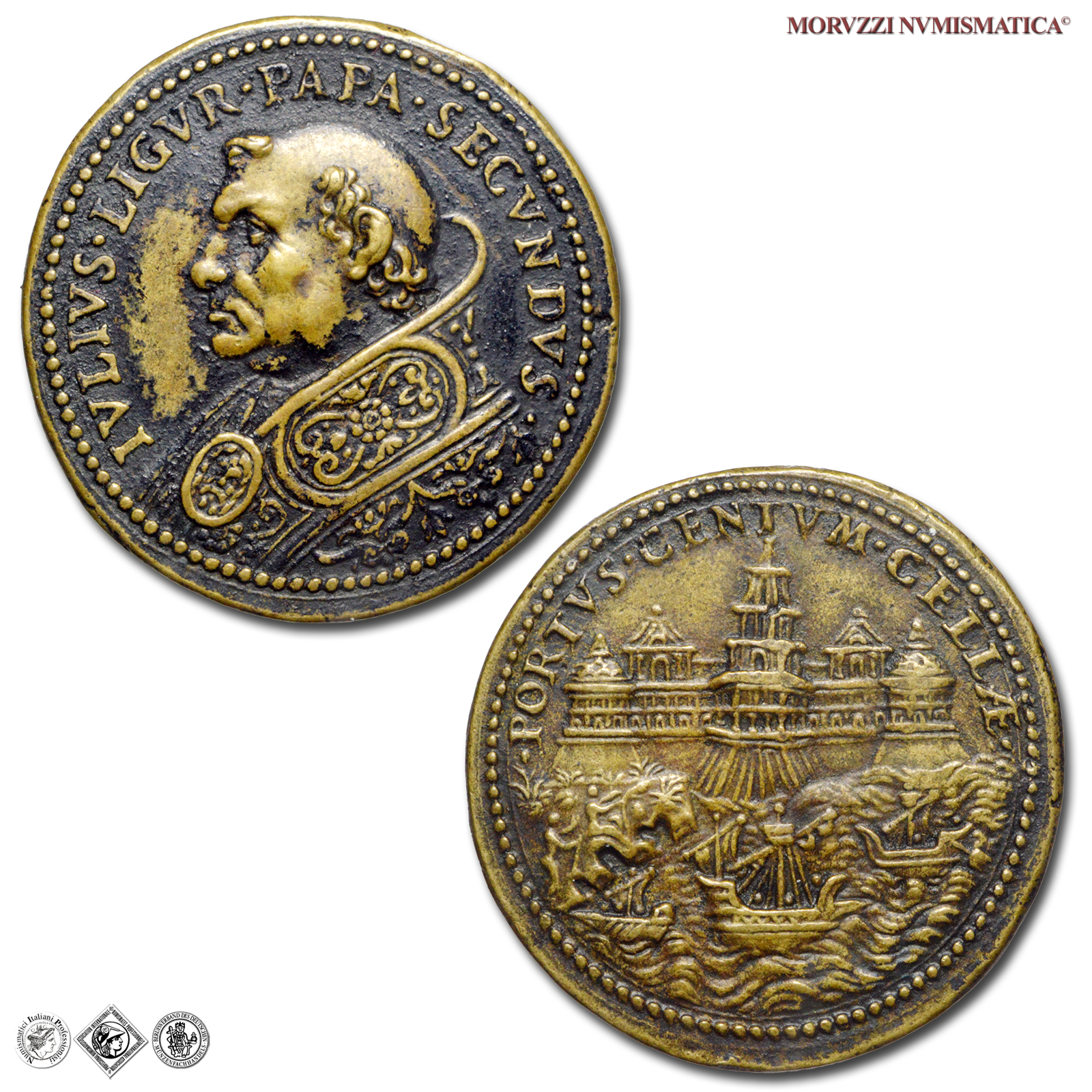 Stato Pontificio, GIULIO II, Della Rovere, 1503-1513, MEDAGLIA, Fortezza e Porto di Civitavecchia, Emissione: 1503, D/ IVLIVS • LIGVR • PAPA • SECVNDVS •, busto con piviale a s., R/ • PORTVS • CENTVM • CELLAE •, vista della Rocca Giulia di Civitavecchia; in basso: tre galee, Rif. bibl. Modesti CNORP I, 219; Mazio e RZ, 35; Metallo: AE, gr. 16,03, (MP160403), Diam.: mm. 32,32, SPL, (R)