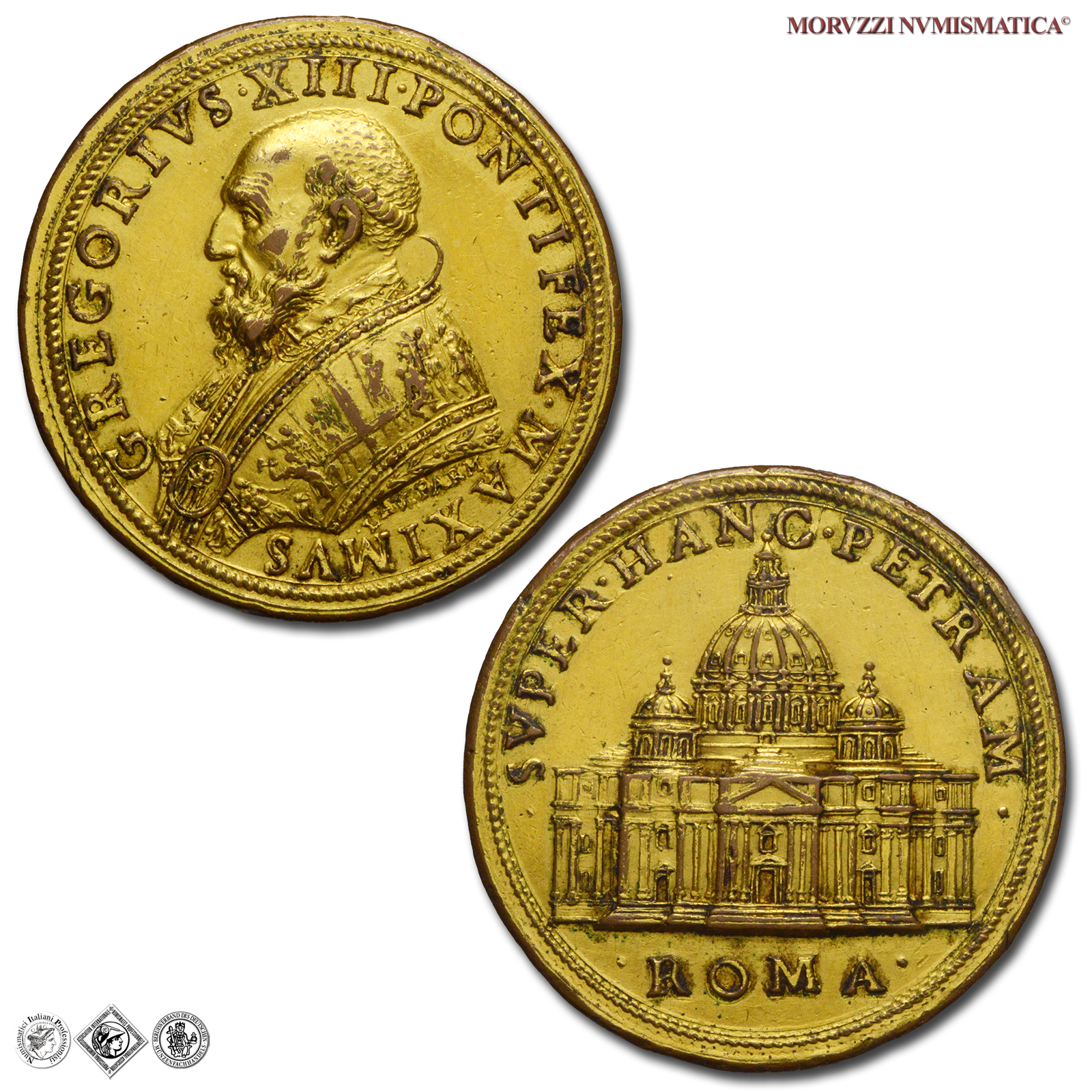 Stato Pontificio, GREGORIO XIII, Boncompagni, 1572-1585, MEDAGLIA, Costruzione di San Pietro, Emissione: 1584, D/ GREGORIVS • XIII • PONTIFEX • MAXIMVS, busto con piviale a s.; sotto: • LAV • PARM •, R/ SVPER • HANC • PETRAM •, la Basilica di San Pietro (progetto); in esego: • ROMA •, Opus Lorenzo Fragni, Rif. bibl. Modesti CNORP, 795; Armand, I-280-18; Metallo: AE dorato, gr. 31,69, (MP160410), Diam.: mm. 39,97, SPL, (RRR)