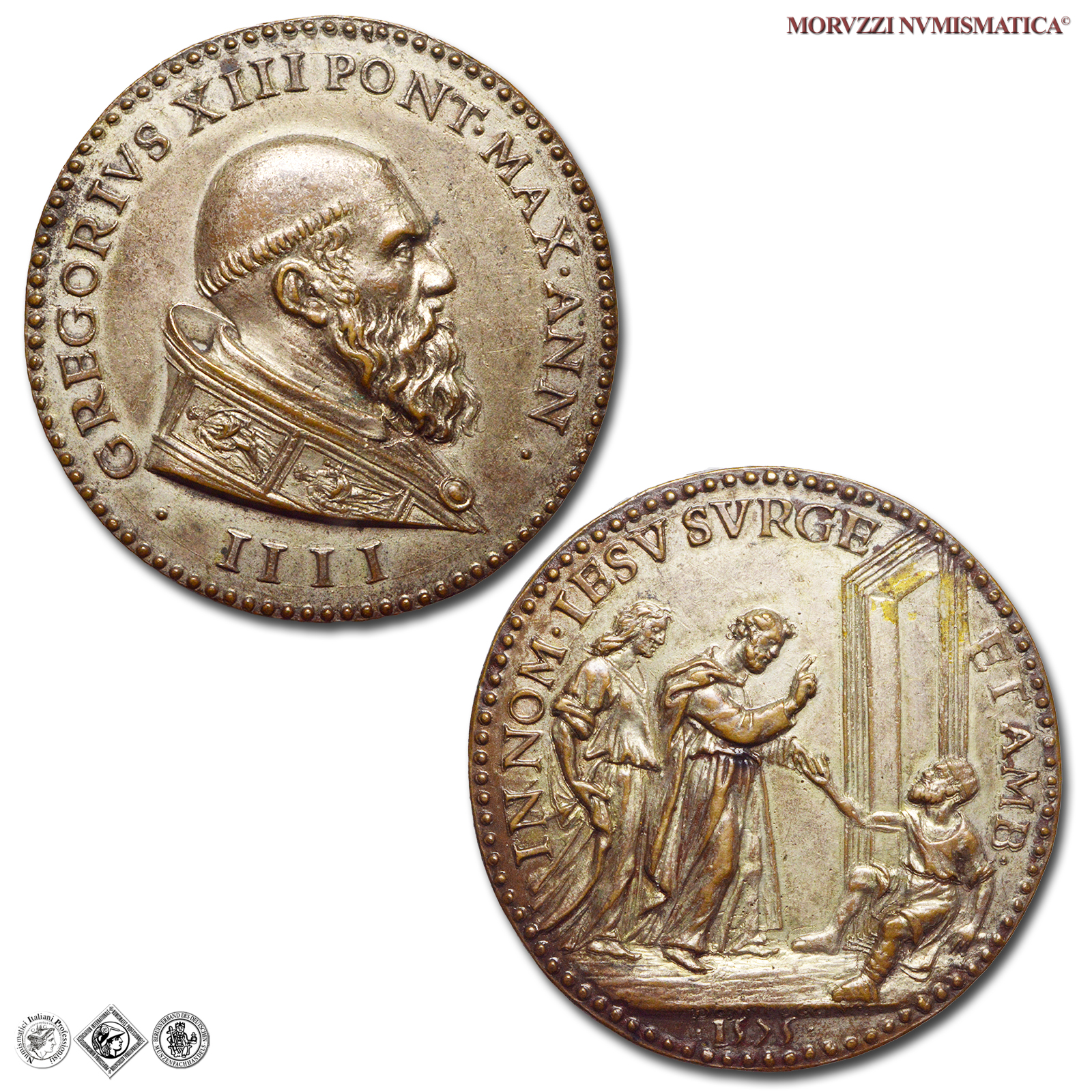 Stato Pontificio, GREGORIO XIII, Boncompagni, 1572-1585, MEDAGLIA, S. Pietro guarisce uno storpio, Emissione: 1575 ANN IIII, D/ GREGORIVS XIII PONT • MAX • ANN • IIII •, busto a d. con piviale, R/ IN NOM • IESV SVRGE ET AMB •, San Pietro benedicente, in piedi a d., accompagnato da San Giovanni, guarisce uno storpio vicino al Tempio di Gerusalemme, Opus Domenico Poggini, Rif. bibl. Modesti, CNORP 724; Pollard Bargello, II-625; Metallo: AE argentato, gr. 31,95, (MP160406), Diam.: mm. 42,25, qFDC, (RRR)