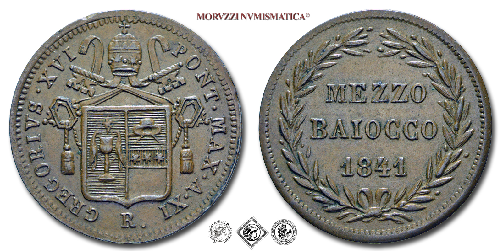 Stato Pontificio, GREGORIO XVI, Cappellari, 1831-1846, MEZZO BAIOCCO, Emissione: 1841, D/ GREGORIVS • XVI - PONT • MAX • A • XI, stemma a targa, sormontato da tiara e chiavi con impugnatura poligonale, cordoni e fiocchi; sotto: il segno di zecca (R.), R/ Entro rami d'ulivo, in tre righe: MEZZO // BAIOCCO // 1841, Zecca di Roma, Rif. bibl. Pagani, 285; Metallo: CU, gr. 4,73, (MX154619), Diam.: mm. 23,71, qFDC