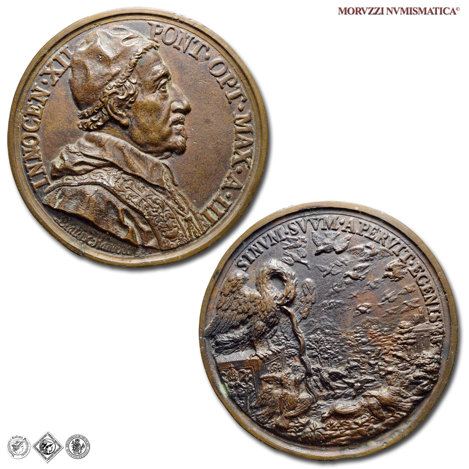 Stato Pontificio, INNOCENZO XII, Pignatelli, 1691-1700, MEDAGLIA FUSA, Opere di carità per i poveri, Emissione: 1694 A III, D/ INNOCEN • XII _ PONT • OPT • MAX • A • III, busto con camauro, mozzetta e stola a destra; sotto: BEATRIX • HAMERANA, R/ SINVM • SVVM • APERVIT • EGENIS, pellicano su piedistallo con stemma Pignatelli coronato da triregno e chiavi decussate e data (1694); con il becco si apre il petto e col sangue nutre i suoi piccoli a terra; alle loro spalle, un paesaggio boscoso con un edificio sulla destra e le montagne sullo sfondo; nel cielo un volo d'uccelli, Opus Beatrice Hamerani, Rif. bibl. Miselli, 310; Lincoln, 1545; Metallo: AE, gr. 125,74, (MP158188), Diam.: mm. 85,34, mSPL, (RR)
