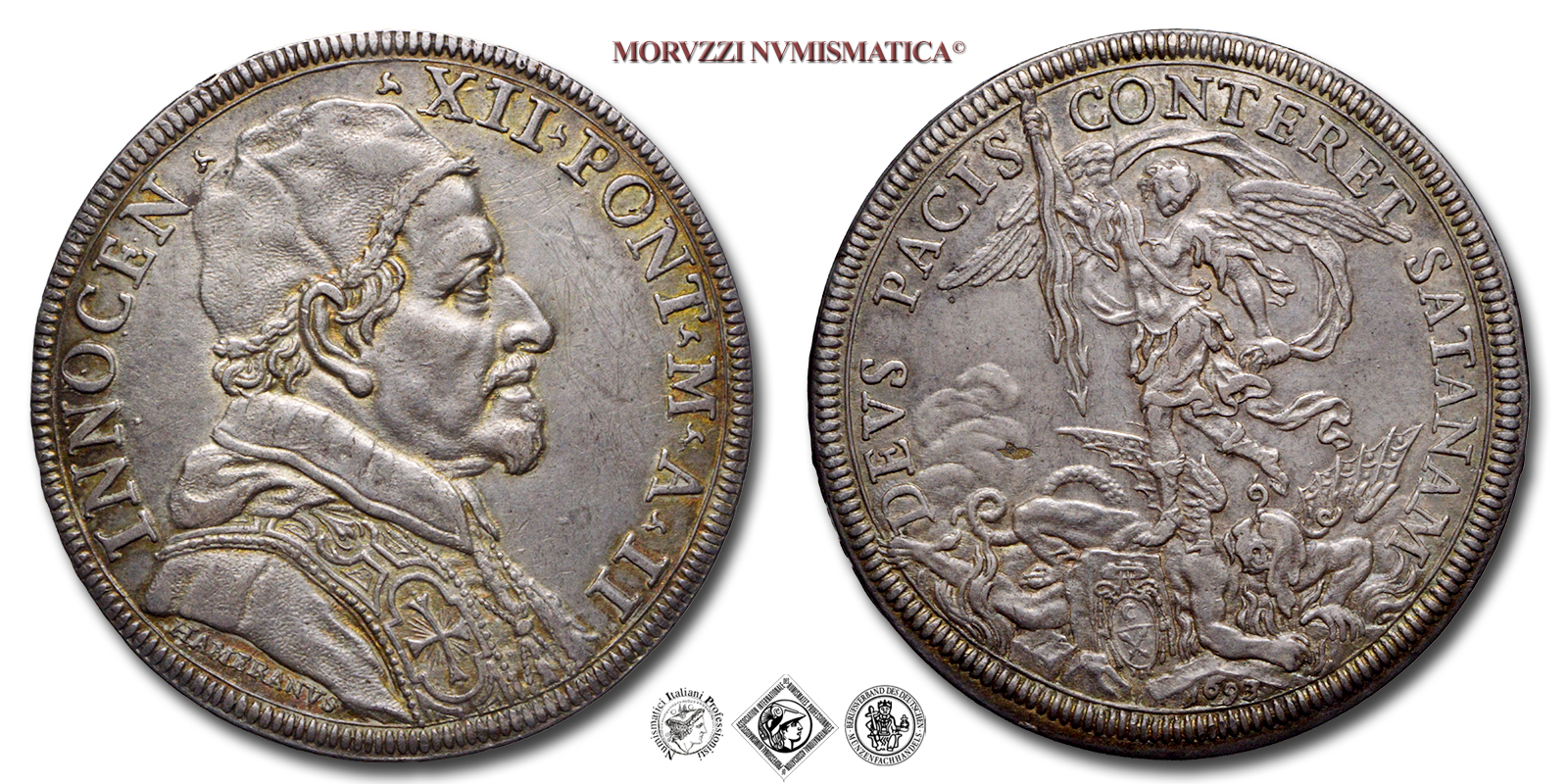 Stato Pontificio, INNOCENZO XII, Pignatelli, 1691-1700, PIASTRA, Emissione: A II 1693, D/ INNOCEN (triscele) - XII (triscele) PONT (triscele) M (triscele) A (triscele) anno di pontificato (II), busto a destra con camauro, stola con croce. In basso firma dell'incisore (HAMERANVS per Giovanni Hamerani), R/ DEVS PACIS CONTERET SATANAM, San Michele fulmina Satana. In basso su una roccia l'armetta di Mons. Farsetti, Presidente delle Zecche. Millesimo (1693) a destra, Zecca di Roma, Rif. bibl. Muntoni, 16; Berman, 2225; Metallo: AR, gr. 31,97, (MX160847), Diam.: mm. 45,41, SPL