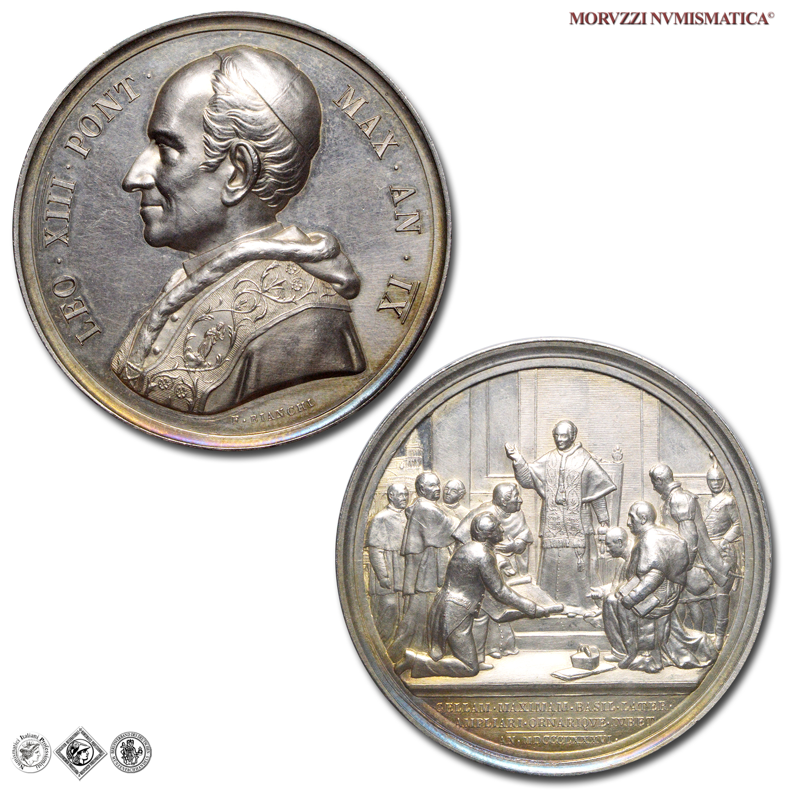 Stato Pontificio, LEONE XIII, Pecci, 1878-1903, MEDAGLIA, Ampliamento e decorazione della Basilica Lateranense, Emissione: 1886 AN IX, D/ LEO • XIII • PONT • MAX • AN • IX •, busto con berretto, mozzetta e stola a s.; sotto: F • BIANCHI •, R/ Il Papa in trono in piedi benedicente riceve i progetti di restauro della Basilica Lateranense; in esergo: CELLAM • MAXIMAM • BASIL • LATER • / AMPLIARI • ORNARIQVE • IVBET / AN • MDCCCLXXXVI, Opus Francesco Bianchi, Rif. bibl. Bart., E886; Metallo: AR, gr. 33,06, (MP159971), Diam.: mm. 43,56, mSPL, (NC)
