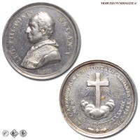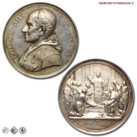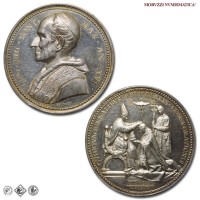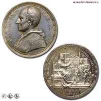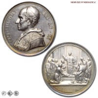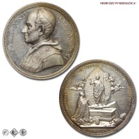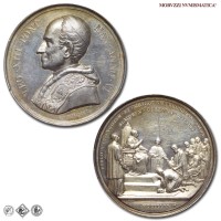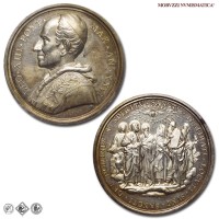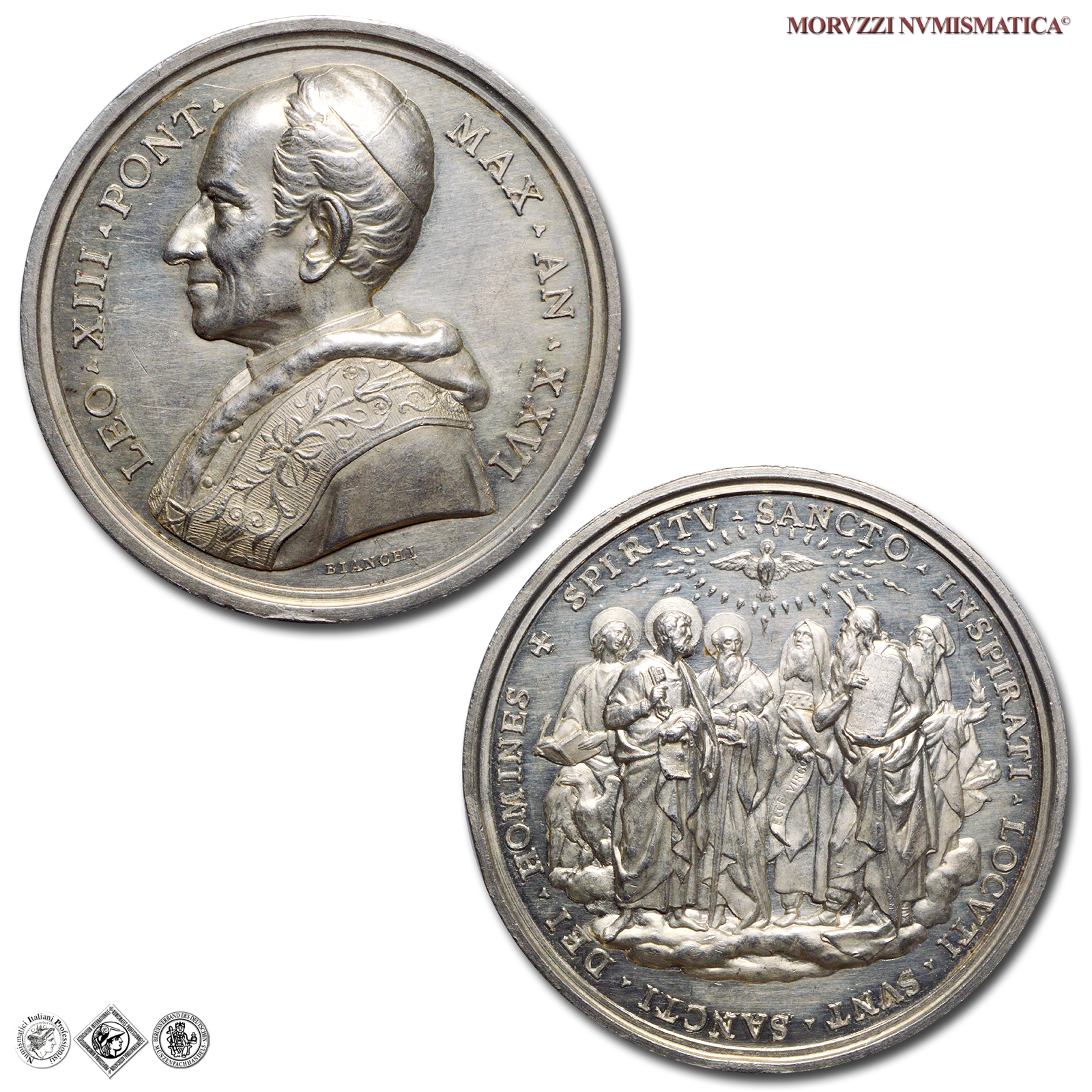 Stato Pontificio, LEONE XIII, Pecci, 1878-1903, MEDAGLIA, Commissione per gli studi biblici, Emissione: AN XXVI (1903), D/ LEO • XIII • PONT • MAX • AN • XXVI, busto con mozzetta, berretto e stola a s.; sotto: BIANCHI, R/ + SPIRITV • SANCTO • INSPIRATI • LOCVTI • SVNT • SANCTI • DEI • HOMINES, sei Santi sulle nubi radiati dalla colomba dello Spirito Santo, Opus Francesco Bianchi, Rif. bibl. Bart., E903; Metallo: AR, gr. 35,07, (MP160665), Diam.: mm. 43,55, qFDC, (NC)