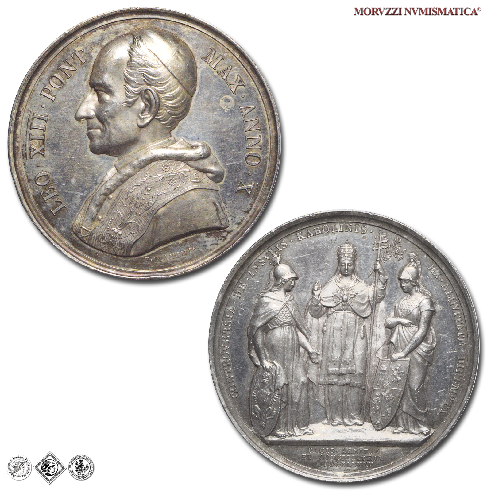Stato Pontificio, LEONE XIII, Pecci, 1878-1903, MEDAGLIA, Controversia per le Isole Caroline, Emissione: 1887 ANNO X, D/ LEO • XIII • PONT • MAX • ANNO • X •, busto con berrettino, mozzetta e stola a s.; sotto: F • BIANCHI •, R/ CONTROVERSIA • DE • INSVLIS • KAROLINIS • EX • AEQVITATE • DIREMPTA, tre figure allegoriche in piedi di fronte: al centro la Chiesa con triregno e croce, a d. la Spagna elmata con scudo Borbonico, a s. la Germania elmata con scudo Prussiano; in esergo, su tre righe: PACIS • ARBITRA / ET CONCILIATRIX / MDCCCLXXXV, Opus Francesco Bianchi, Rif. bibl. Bart., E887; RZ, 808; Metallo: AR, gr. 35,31, (MP159975), Diam.: mm. 43,62, mSPL, (NC)
