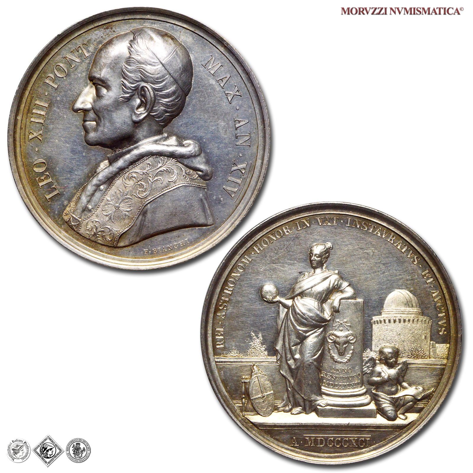 Stato Pontificio, LEONE XIII, Pecci, 1878-1903, MEDAGLIA, Istituzione della Specola Vaticana, Emissione: 1891 AN XIV, D/ LEO XIII PONT MAX AN XIV, busto con mozzetta, berretto e stola a s.; sotto: F BIANCHI, R/ REI ASTRONOM HONOR IN VAT INSTAVRATVS ET AVCTVS, figura allegorica dell'Astronomia in piedi si appoggia ad una colonna e regge un emisfero; sulla d.: l'edificio della Specola Vaticana / A MDCCCXCI, Opus Francesco Bianchi, Rif. bibl. Bart., E891; Metallo: AR, gr. 36,60, (MP150420), Diam.: mm. 43,58, mSPL, (NC)