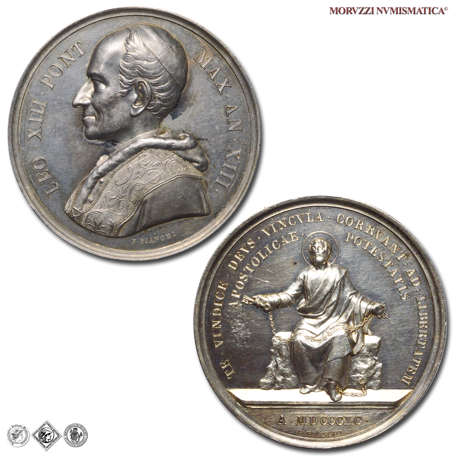 Stato Pontificio, LEONE XIII, Pecci, 1878-1903, MEDAGLIA, Libertà del Ministero Apostolico, Emissione: 1890 AN XIII, D/ LEO • XIII • PONT • MAX • AN • XIII •, busto con mozzetta, berretto e stola a s.; sotto: F • BIANCHI •, R/ TE • VINDICE • DEVS • VINCVLA • CORRVANT • AD • LIBERTATEM / APOSTOLICAE • POTESTATIS, San Pietro seduto di fronte nimbato in catene, Opus Francesco Bianchi, Rif. bibl. Bart., E890; Metallo: AR, gr. 35,19, (MP150419), Diam.: mm. 43,63, mSPL, (NC)