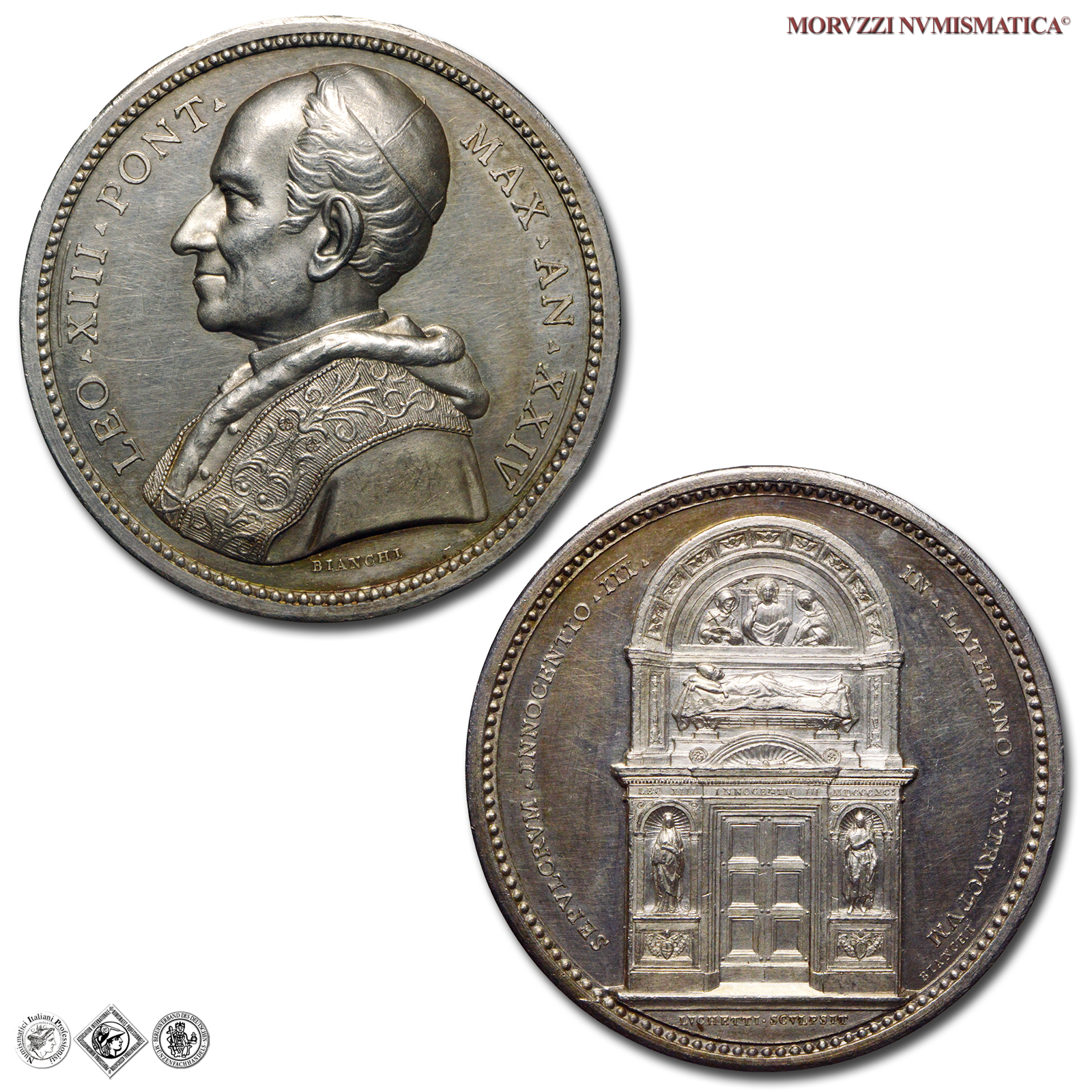 Stato Pontificio, LEONE XIII, Pecci, 1878-1903, MEDAGLIA, Monumento sepolcrale di Innocenzo III, Emissione: AN XXIV, D/ LEO • XIII • PONT • MAX • AN • XXIV •, busto con berrettino, mozzetta e stola a s.; sotto: BIANCHI, R/ SEPVLCRVM • INNOCENTIO • III • IN • LATERANO • EXTRVCTVM, prospetto del monumento sepolcrale di Innocenzo III, a San Giovanni in Laterano; in esergo: LUCCHETTI • SCVLPSIT, Opus Francesco Bianchi, Rif. bibl. Bart., E901; Metallo: AR, gr. 35,25, (MP150430), Diam.: mm. 43,64, mSPL, (NC)