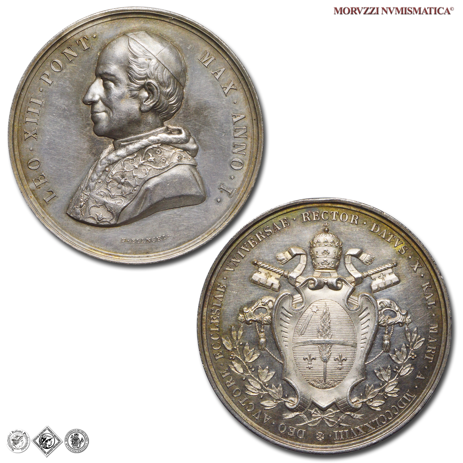 Per l'elezione al pontificato, Emissione: 1878 ANNO I, Opus Francesco Bianchi, Rif. bibl. Bart., E878; Metallo: AR, gr. 34,04, (MP150428), Diam.: mm. 43,88, SPL, (R)