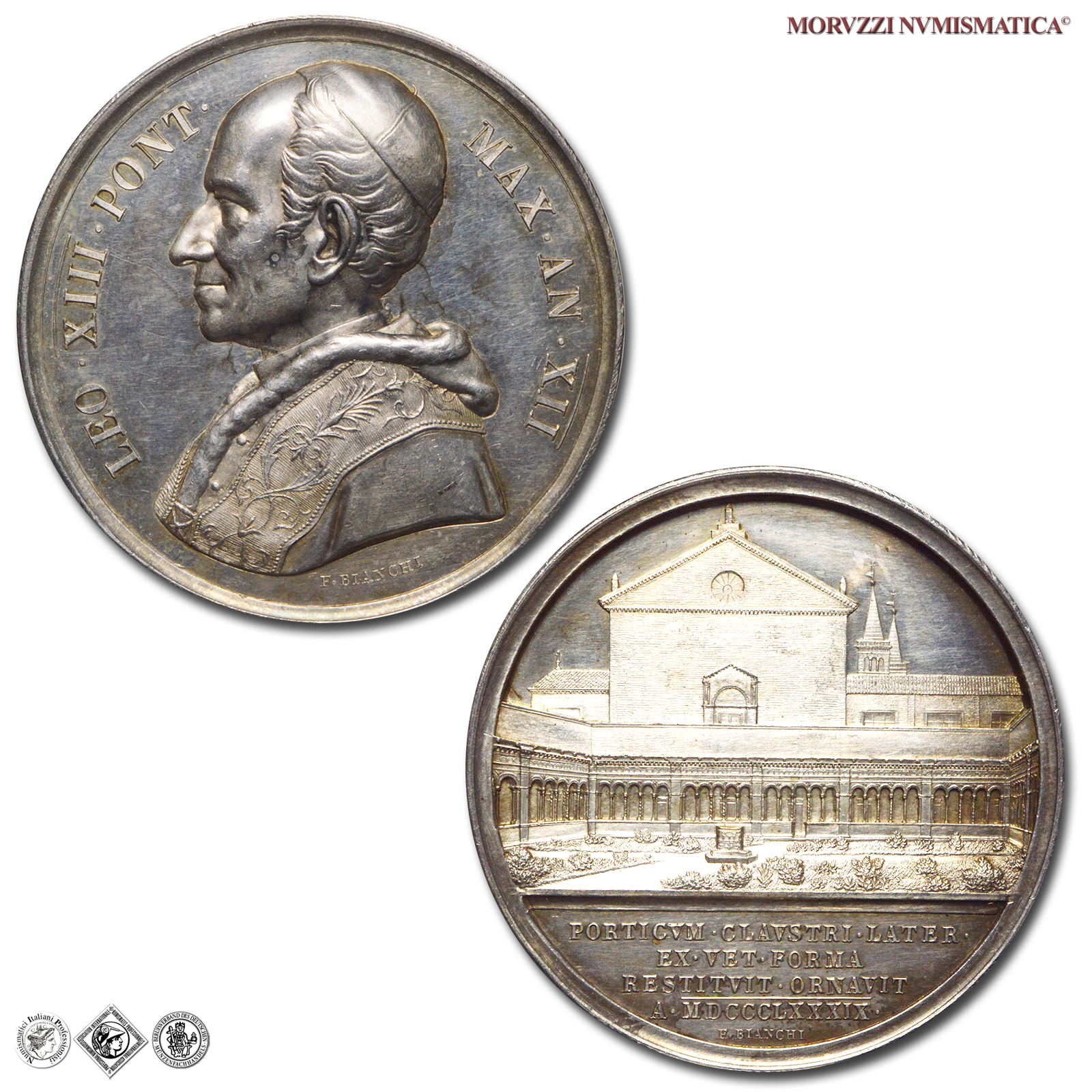Stato Pontificio, LEONE XIII, Pecci,1878-1903, MEDAGLIA, Restauri al Chiostro Lateranense, Emissione: 1889 AN XII, D/ LEO • XIII • PONT • MAX • AN • XII •, busto con berretto, mozzetta e stola a s.; sotto: F • BIANCHI •, R/ prospetto del Chiostro Lateranense; in esergo: PORTICVM • CLAVSTRI • LATER • / EX • VET • FORMA / RESTITVIT • ORNAVIT / A • MDCCCLXXXIX, Opus Francesco Bianchi, Rif. bibl. Bart., E889; Metallo: AR, gr. 36,42, (MP150418), Diam.: mm. 43,65, mSPL, (NC)