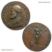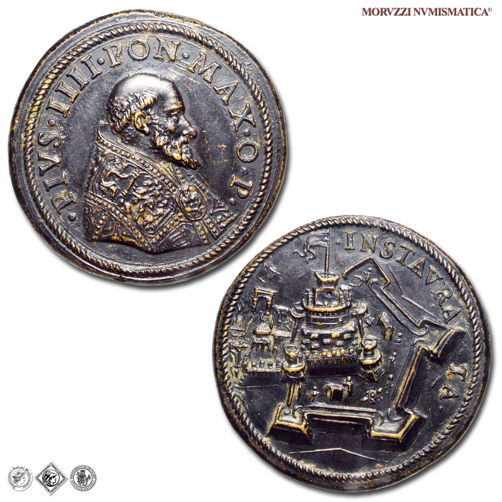 Stato Pontificio, PIO IV, de' Medici, 1559-1565, MEDAGLIA, Fortificazioni a Castel Sant'Angelo, Emissione: 1559, D/ • PIVS • IIII • PON • MAX • O • P •, busto a d. con piviale, R/ • INSTAVRA _ TA •, vista a volo d'uccello di Castel Sant'Angelo con le fortificazioni, Opus Gian Federico Bonzagni, Alessandro Cesati - Il Grechetto, Rif. bibl. Modesti, CNORP 523; Metallo: AE, gr. 23,35, (MP160404), Diam.: mm. 32,27, mSPL, (R)