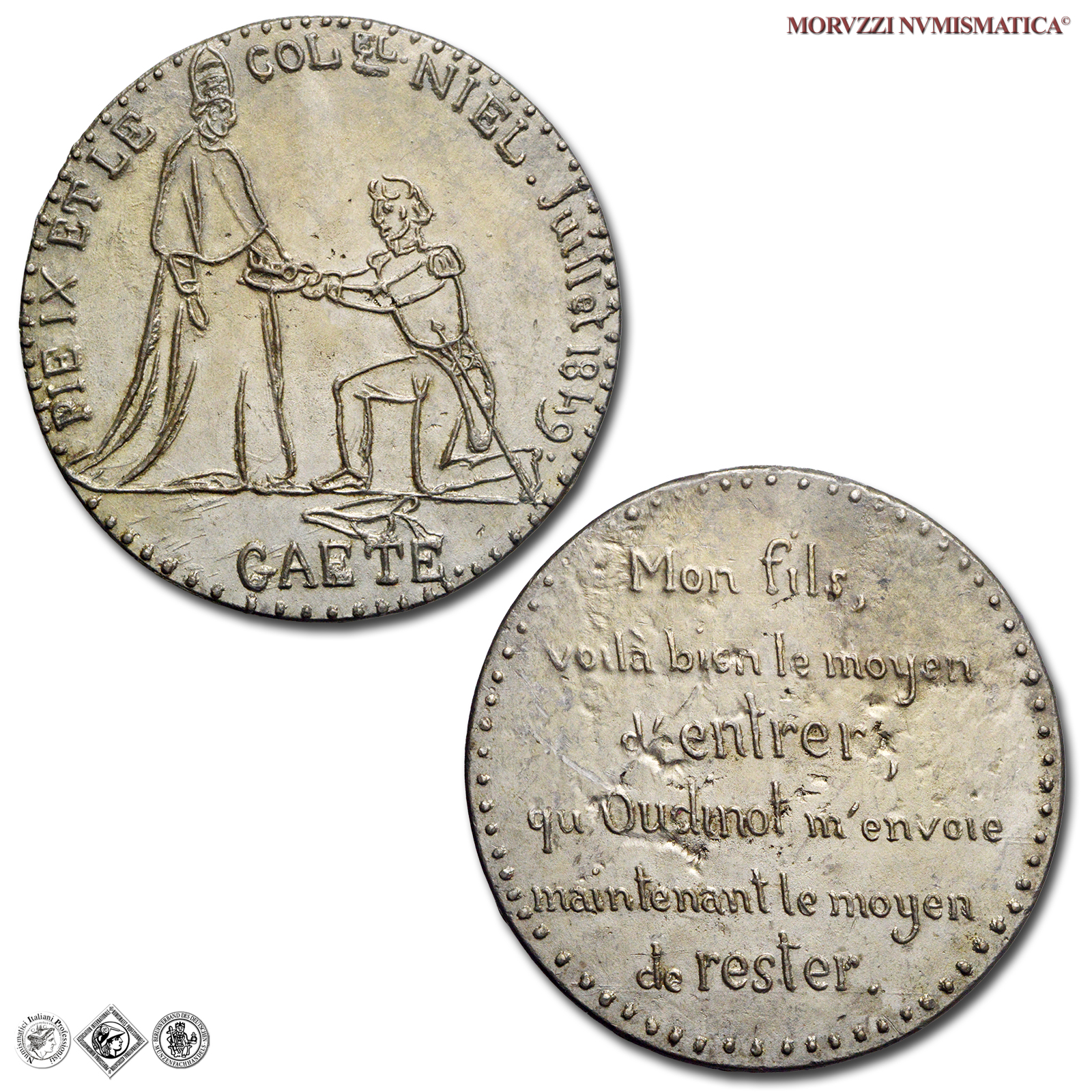 Stato Pontificio, PIO IX, Mastai Ferretti, 1846-1878, MEDAGLIA, Emissione: 1849, D/ PIE IX ET LE _ COL. EL NIEL. JUILLET 1849, Il Papa a s. in piedi con triregno e piviale riceve un vassoio di chiavi (le chiavi di Roma) dal Colonnello Neil genuflesso; sotto: GAETE, R/ nel campo: MON FILS, = VOILA BIEN LE MOYEN = D'ENTRER = QU'OUDINOT M'ENVOIE = MAINTENANT LE MOYEN = DE RESTER, Rif. bibl. Bart., IV-8; gr. 23,91, (MP152228), Diam.: mm. 47,26, mSPL, (RRR)