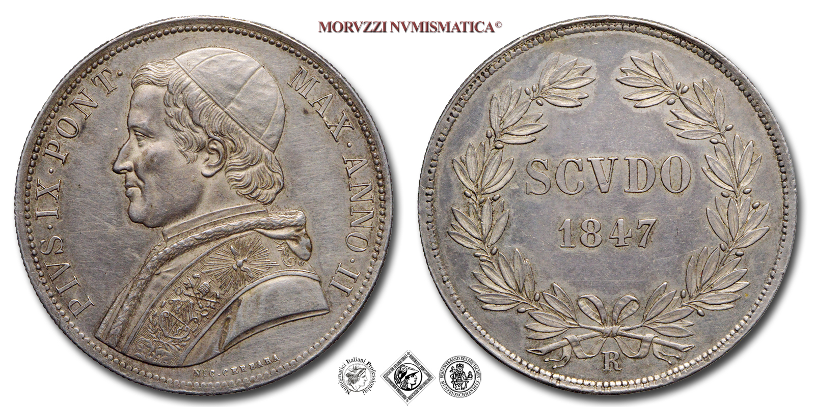 Stato Pontificio, PIO IX, Mastai Ferretti, 1846-1870, SCUDO, Emissione: 1847 ANNO II, D/ PIVS • IX • PONT • MAX • AN •, busto a sinistra, con zucchetto, mozzetta e stola. Sotto il busto firma del'incisore (NIC. CERBARA), R/ All'interno di rami di alloro, in due righe, il valore (SCVDO) e la data (1847). Sotto segno della zecca (R), Zecca di Roma, Rif. bibl. Pagani, 310; Metallo: AR, gr. 26,96, (MX160860), Diam.: mm. 37,71, qFDC, (NC)