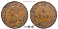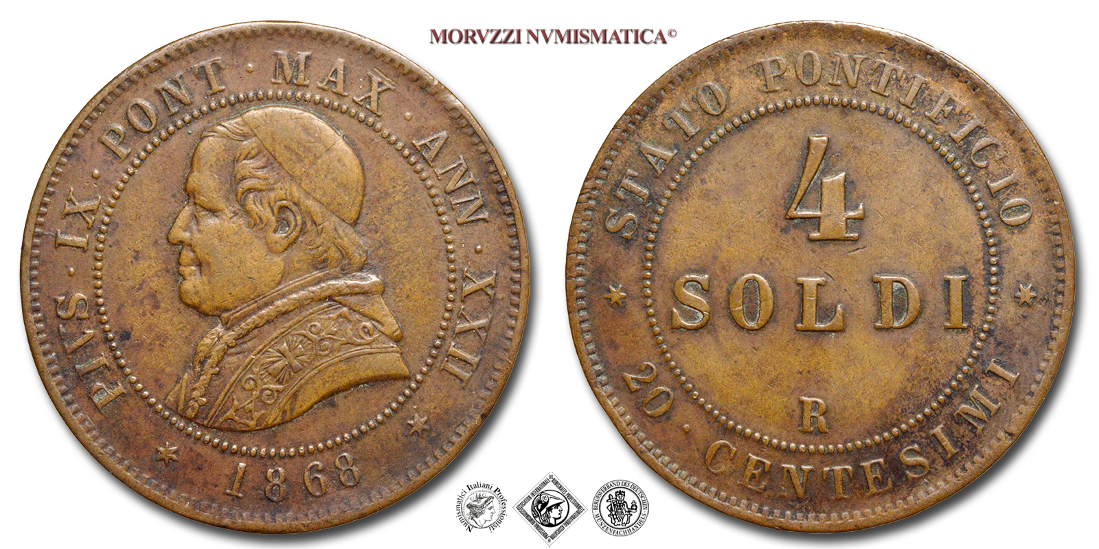Stato Pontificio, PIO IX, Mastai Ferretti, 1846-1870, SOLDI 4, Emissione: 1868 ANN XXII, D/ busto a sinistra con zucchetta di Pio IX all'interno di un cerchio di perline. All'esterno del cerchio di perline PIVS • IX • PONT • MAX • ANN • XXII. In basso il millesimo (1868) tra due stellette a sei punte, R/ Nel campo all'interno di un cerchio di perline, prima indicazione di valore (4 SOLDI) su due righe, sotto segno di zecca (R). All'esterno del cerchio STATO PONTIFICIO e seconda indicazione del valore (20 • CENTESIMI) tra due stellette a sei punte, Zecca di Roma, Rif. bibl. Pagani, 593; Metallo: CU, gr. 19,76, (MX73749), Diam.: mm. 35,93, mBB
