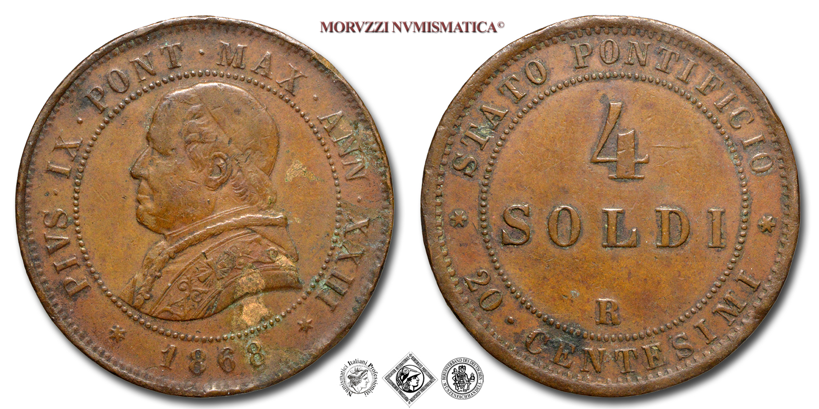 Stato Pontificio, PIO IX, Mastai Ferretti, 1846-1870, SOLDI 4, Emissione: 1868 ANN XXIII, D/ busto a sinistra con zucchetta di Pio IX all'interno di un cerchio di perline. All'esterno del cerchio di perline PIVS • IX • PONT • MAX • ANN • XXIII. In basso il millesimo (1868) tra due stellette a sei punte, R/ Nel campo all'interno di un cerchio di perline, prima indicazione di valore (4 SOLDI) su due righe, sotto segno di zecca (R). All'esterno del cerchio STATO PONTIFICIO e seconda indicazione del valore (20 • CENTESIMI) tra due stellette a sei punte, Zecca di Roma, Rif. bibl. Pagani, 594; Metallo: CU, gr. 20,03, (MX51681), Diam.: mm. 35,95, mBB