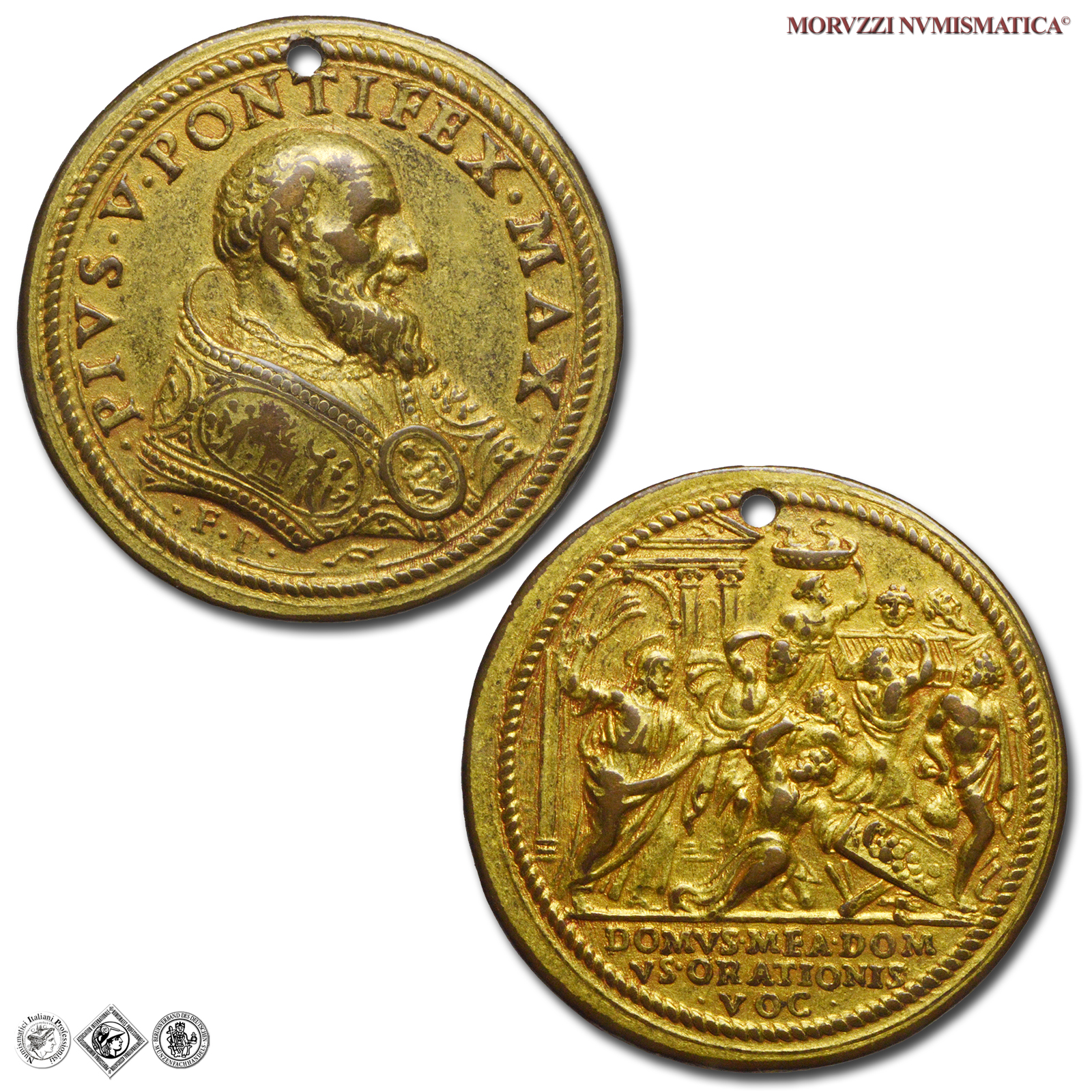 Stato Pontificio, PIO V, Ghislieri, 1566-1572, MEDAGLIA DORATA, Riforma del Clero Cattolico, Emissione: 1566-1572, D/ • PIVS • V • PONTIFEX • MAX •, busto a d. con piviale decorato, R/ • DOMVS • MEA • DOMVS • ORATIONIS • VOC •, Gesù scaccia i mercanti dal tempio, Opus Giovanni Federico Bonzagni, detto il Parmense, Rif. bibl. Modesti, CNORP III, 608; Patrignani, 53; Metallo: AE dorato, gr. 21,68, (MP161604), Diam.: mm. 32,02, SPL, (RR)