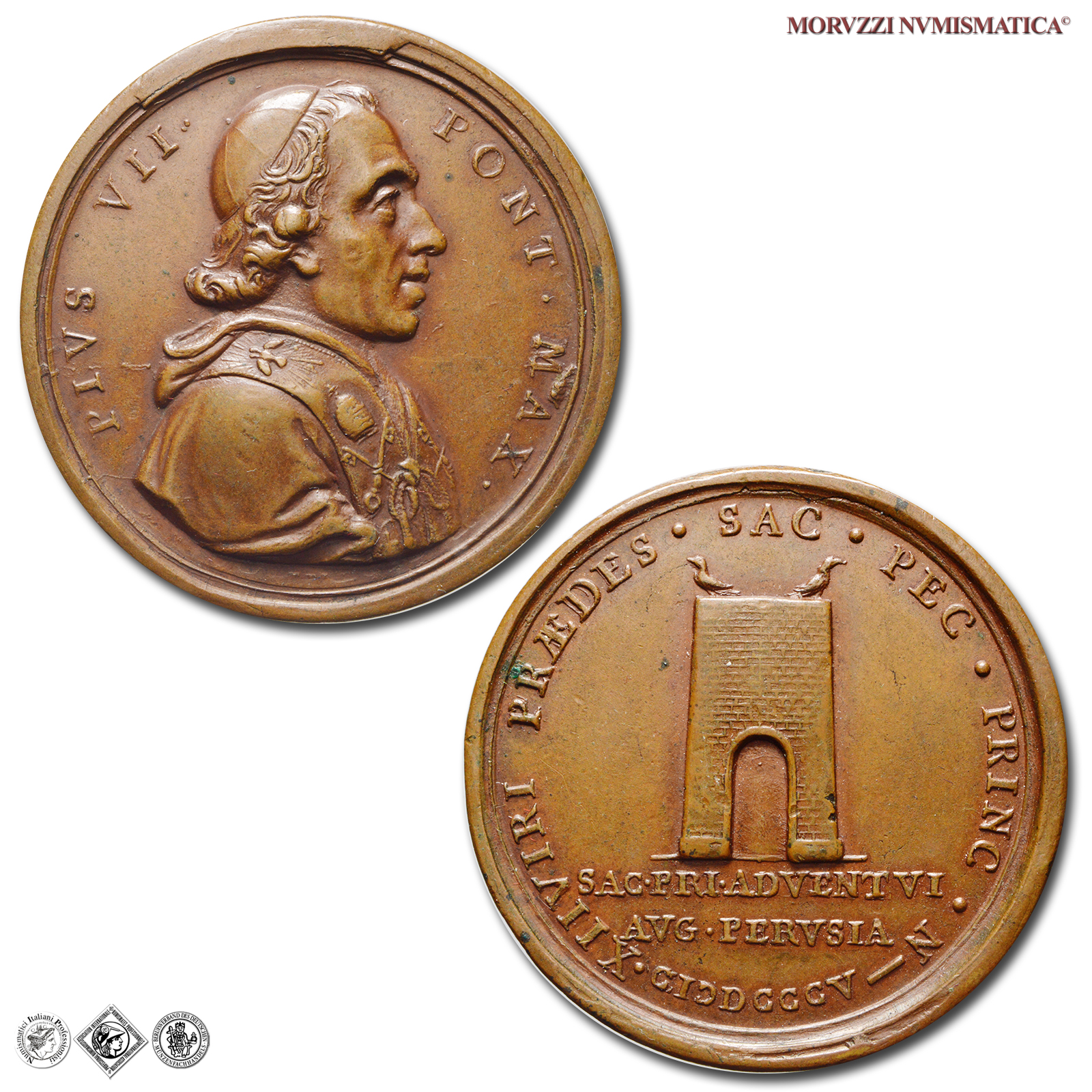 Stato Pontificio, PIO VII, Chiaramonti, 1800-1823, MEDAGLIA, La porta Etrusca a Perugia, Emissione: 1805, D/ PIVS VII • PONT • MAX •, busto a d. con berretto, mozzetta e stola, R/ • XIIVIRI PAEDES • SAC • PEC • PRINC • N - = >I>>CCCV, la porta etrusca a Perugia, sopra, ai lati due oche; sotto: SAC . PRI . ADVENTVI / AVG . PERVSIA, Opus Tommaso Mercandetti, Rif. bibl. Patrignani, 41; Bertuzzi, 69; Metallo: AE, gr. 27,61, (MP147748), Diam.: mm. 38,77, mSPL, (R)