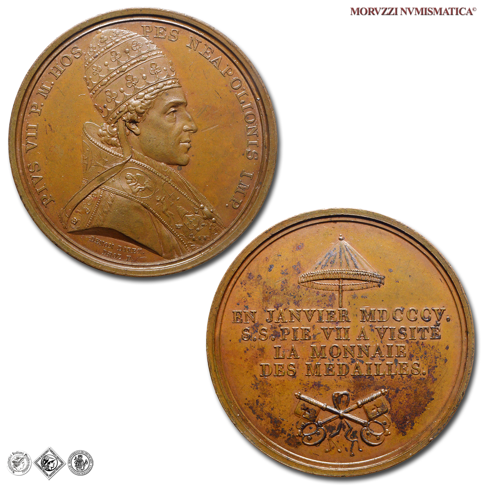 Stato Pontificio, PIO VII, Chiaramonti, 1800-1823, MEDAGLIA, Visita alla Zecca di Parigi, Emissione: 1805, D/ PIVS VII P • M • HOS _ PES NEAPOLIONIS IMP •, busto a d. con triregno e piviale; sotto: DENON DIREX. = DROZ F., R/ ombrellone / EN JANVIER MDCCCV. / S. S. PIE VII A VISITE' / LA MONNAIE / DES MEDAILLES. / chiavi decussate legate da nastro, Opus Jean Pierre Droz, Rif. bibl. Patrignani, 18; Johnson, 959; Metallo: AE, gr. 35,58, (MP142508), Diam.: mm. 40,64, qFDC, (R)
