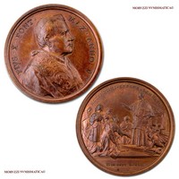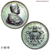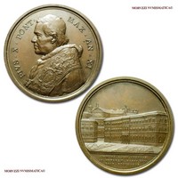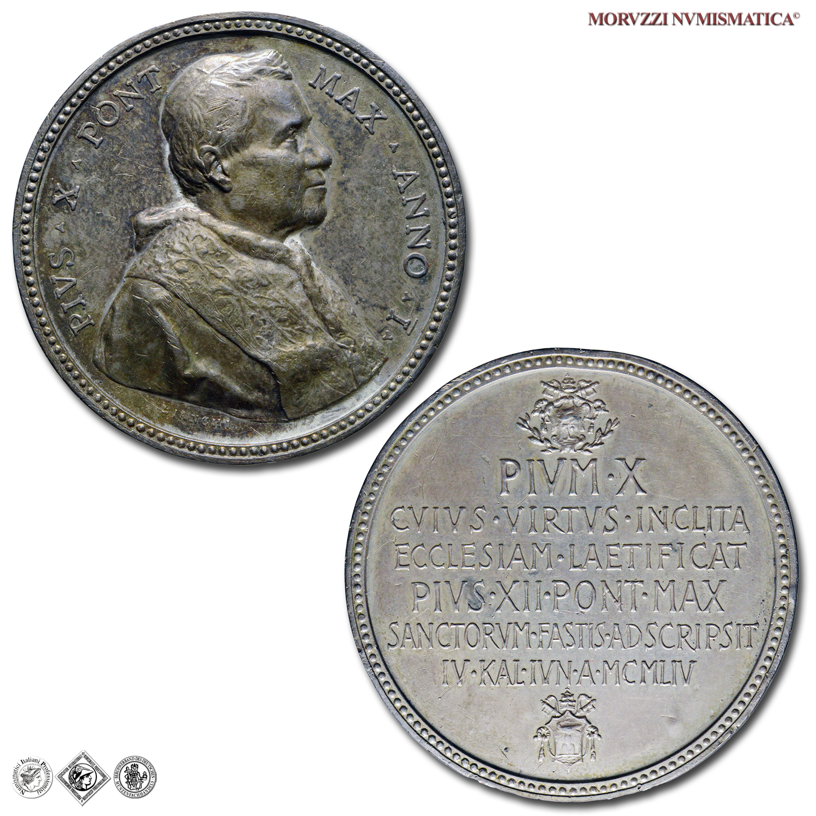 Medaglia straordinaria coniata, emessa il 29 maggio 1954 da Pio XII, con fondo lucido, dalla Zecca d'Italia, a ricordo della Canonizzazione di Pio X.