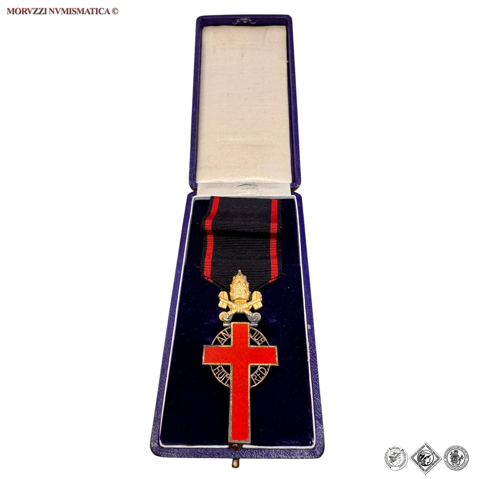 Medaglia a Croce su doppio cerchio a telaio coniata e sorretta da triregno su chiavi decussate, emessa quale premio ai Benemerenti del Giubileo Straordinario della Redenzione. Distribuita con nastrino nero con due pali rossi.