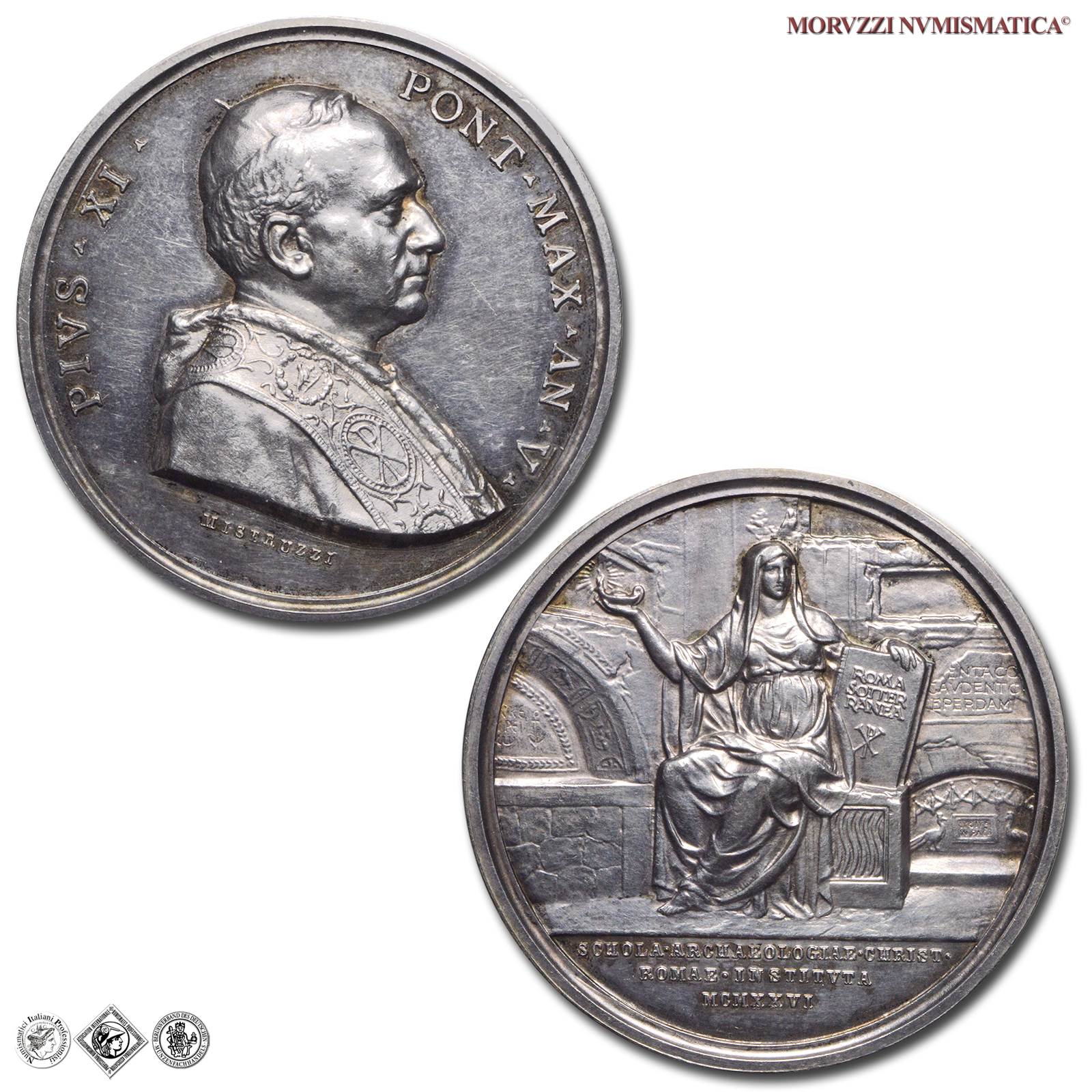 Stato Pontificio, Pio XI, Ratti, 1922-1939, MEDAGLIA, Istituzione Pontificio Istituto di Archeologia Cristiana, Emissione: 1926 AN V, D/ PIVS • XI • PONT • MAX • AN • V •, busto a d., con berretto, mozzetta e stola; sotto: MISTRVZZI, R/ figura muliebre seduta su di un sarcofago, all'interno delle Catacombe romane, tiene nella destra alzata la lampada accesa e nella sinistra un libro con su iscritto ROMA / SOTTER / RANEA; in esergo: SCHOLA • ARCHAEOLOGIAE • CHRIST / ROMAE • INSTITVTA / MCMXXVI, Opus Aurelio Mistruzzi, Rif. bibl. Bart., E926; Metallo: AR, gr. 35,32, (MP159924), Diam.: mm. 44,23, FDC, (R)
