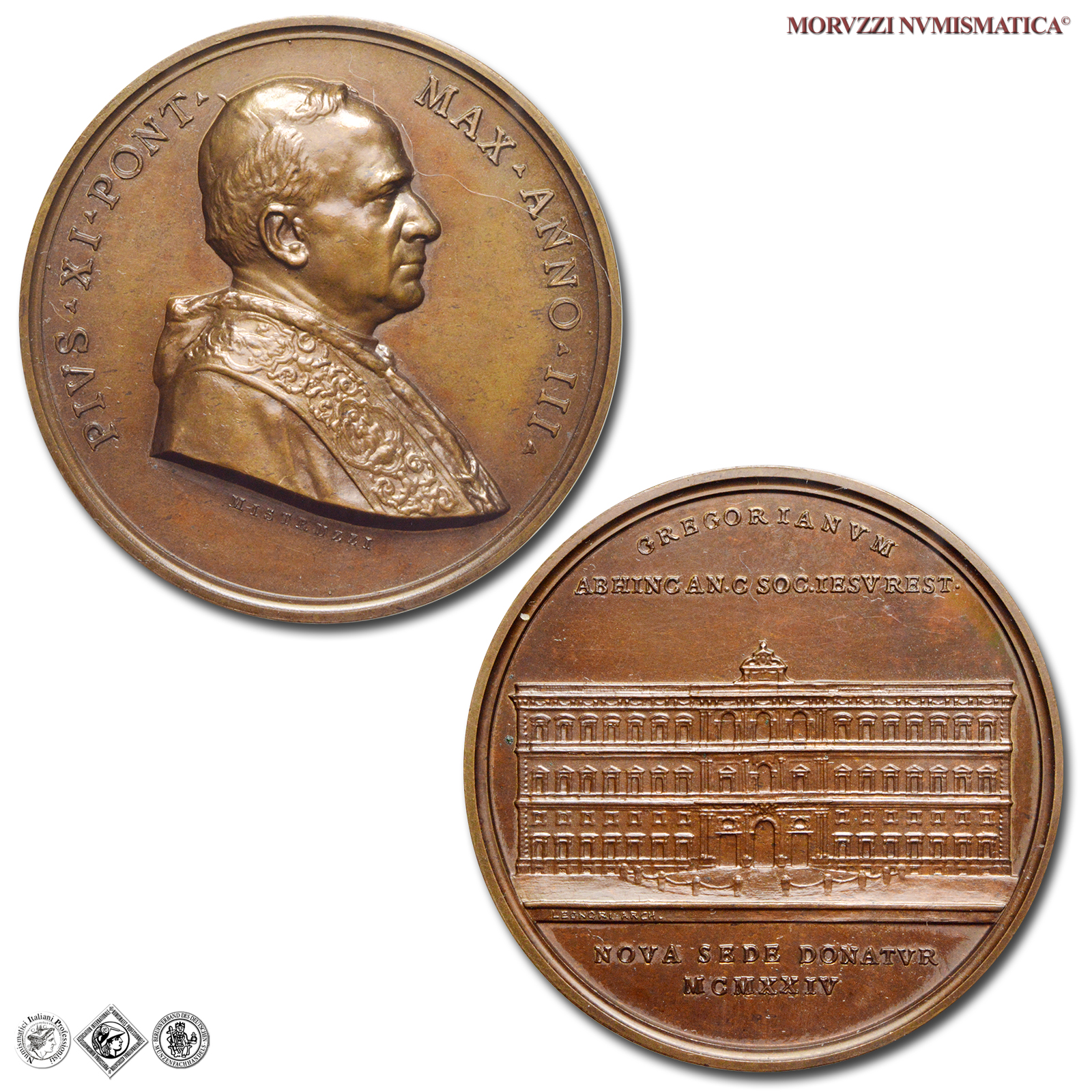 Stato Pontificio, PIO XI, Ratti, 1922-1939, MEDAGLIA, Nuova Sede dell'Università Gregoriana, Emissione: 1924 ANNO III, D/ PIVS • XI • PONT • MA X. ANNO • III •, busto a d., con berretto, mozzetta e stola; sotto: MISTRVZZI, R/ GREGORIANVM ABHINC AN. C SOC. IESV REST •, prospetto del nuovo edificio; in esergo: NOVA SEDE DONATVR / MCMXXIV, Opus Aurelio Mistruzzi, Rif. bibl. Bart., E924; Metallo: AE, gr. 33,24, (MP140996), Diam.: mm. 44,13, FDC, (R)