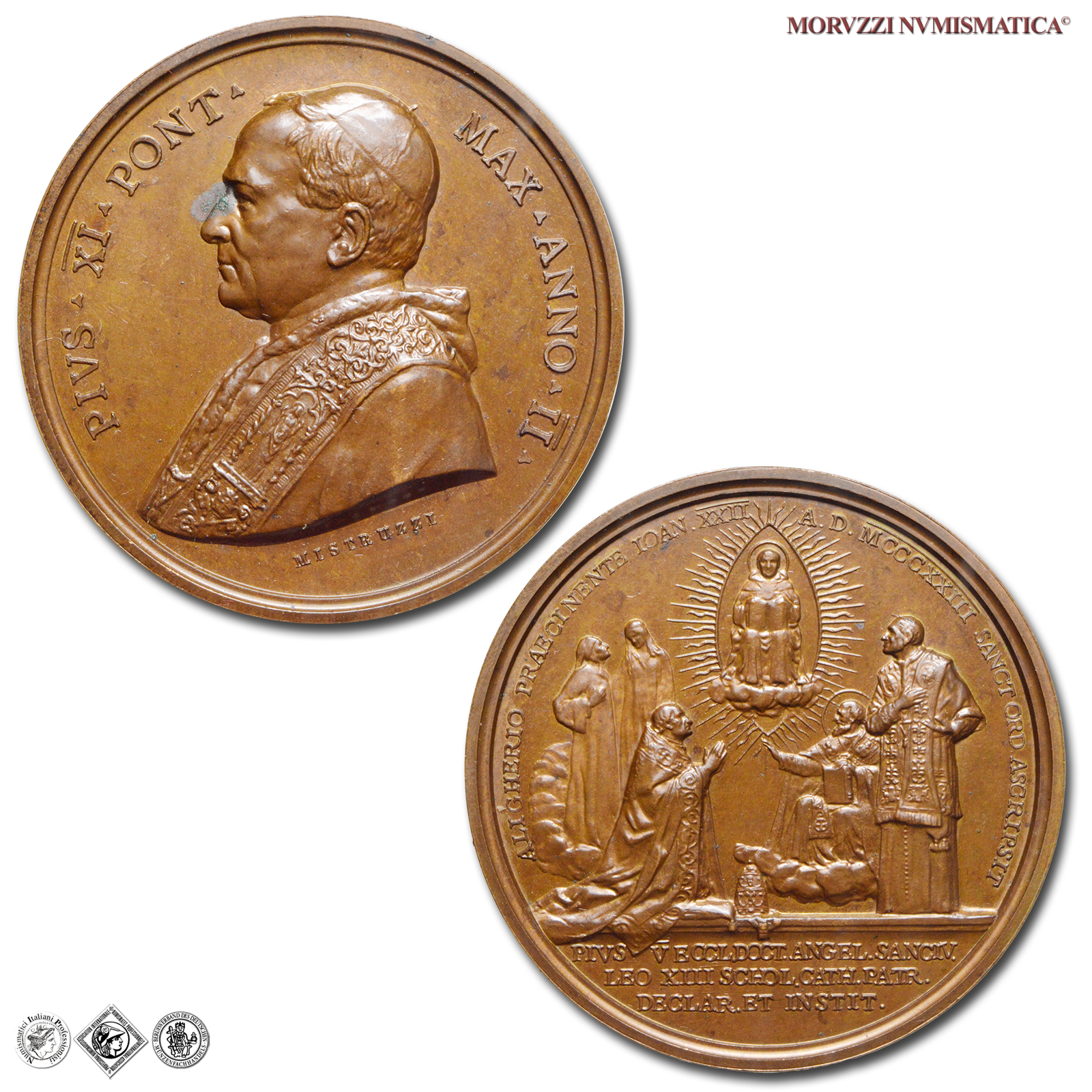 Stato Pontificio, PIO XI, Ratti, 1922-1939, MEDAGLIA, VI centenario della canonizzazione di San Tommaso d'Aquino, Emissione: 1923 ANNO II, D/ PIVS • XI • PONT • MAX • ANNO • II • (punti celtici), busto del Pontefice a s.; sotto: MISTRUZZI, R/ ALIGHERIO PRAECINENTE JOAN. XXII A. D. MCCCXXIII SANCT. ORD. ASCRIPSIT, San Tommaso entro ovale raggiante, a s. su nubi, Dante e Beatrice; in primo piano Giovanni XXII genuflesso a d. innanzi a San Pio V seduto ed a Leone XIII in piedi; in esergo: PIVS V ECCL. DOCT. ANGEL. SANCIV. / LEO XIII SCHOL. CATH. PATR. / DECLAR. ET INSTIT., Opus Aurelio Mistruzzi, Rif. bibl. Bart., E923; Metallo: AE, gr. 31,12, (MP140993), Diam.: mm. 44,07, FDC, (R)