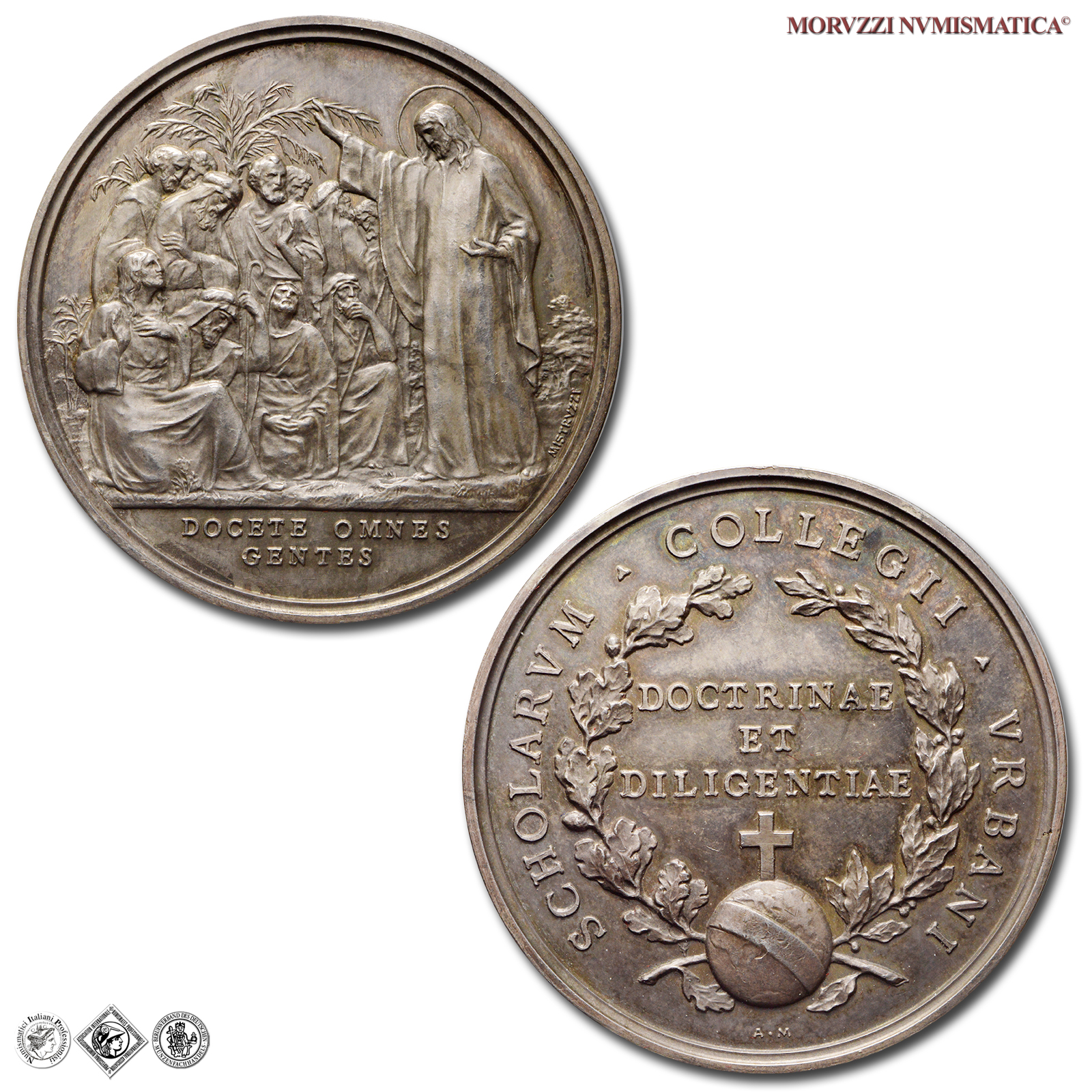 Stato Pontificio, PIO XI, Ratti, 1922-1939, MEDAGLIA, Collegio Urbano di Propaganda Fide, Emissione: 1931, D/ Gesú Cristo nimbato, in piedi e volto a sinistra, istruisce gli Apostoli; a destra presso il bordo: MISTRVZZI; in esergo: DOCETE OMNES / GENTES, R/ SCHOLARVM • COLLEGII • VRBANI, tra rami d'alloro e quercia, fermati in basso da globo sormontato da Croce: DOCTRINAE / ET / DILIGENTIAE; in basso: A • M, Opus Aurelio Mistruzzi, Metallo: AR, gr. 34,32, (MP146952), Diam.: mm. 42,34, qFDC, (R)