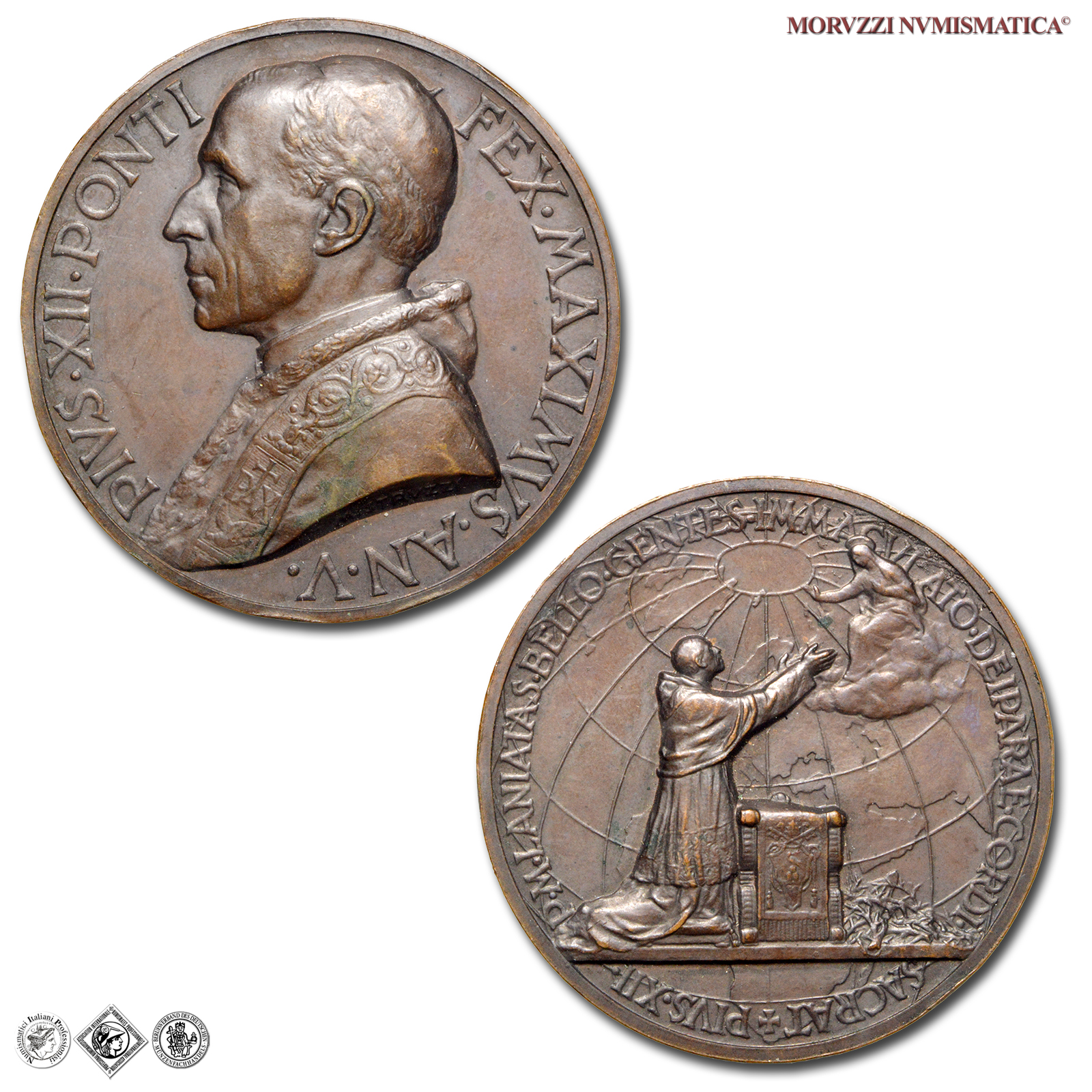 Stato Pontificio, PIO XII, Pacelli, 1939-1958, MEDAGLIA, Consacrazione dei popoli in guerra alla Beata Vergine, Emissione: 1943 AN V, D/ PIVS • XII • PONTIFEX • MAXIMVS • AN • V •, busto a s., con berretto, mozzetta e stola; sul taglio spalla: MISTRVZZI, R/ PIVS • XII • P • M • LANIATAS • BELLO • GENTES • IMMACVLATO • DEIPARAE • CORDI • SACRAT ✠, il Pontefice in ginocchio a d., prega la Vergine che appare tra le nubi. Sullo sfondo l'Europa e groviglio di spine, Opus Aurelio Mistruzzi, Rif. bibl. Bart., E943; Metallo: AE, gr. 34,02, (MP140960), Diam.: mm. 43,87, SPL