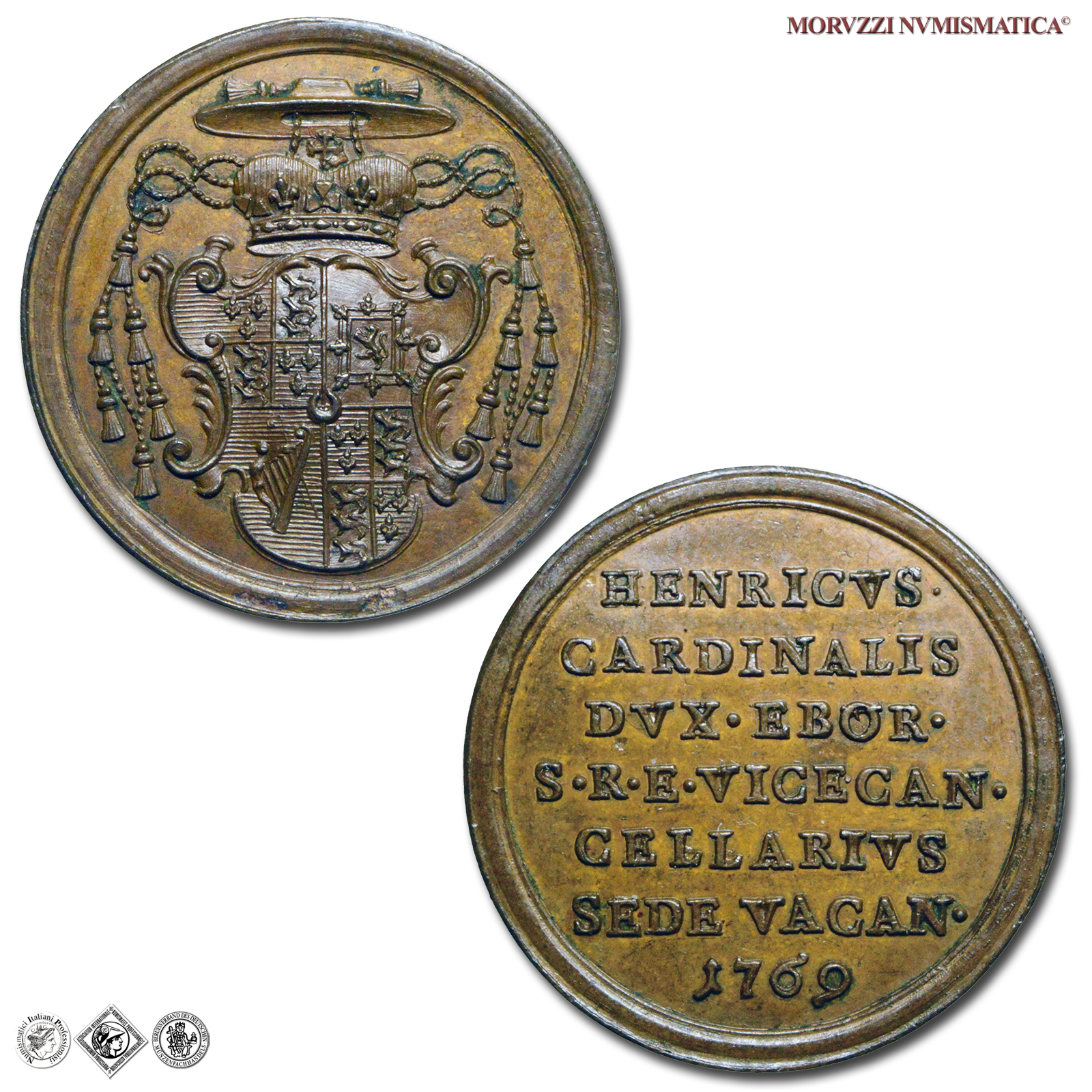 Stato Pontificio, SEDE VACANTE, 1769, MEDAGLIA, Vice Cancelliere Card. E. Stuart - Duca di York, Emissione: 1769, D/ stemma coronato del Card. Duca di York, sormontato da galero a sei nodi, R/ nel campo: HENRICVS • / CARDINALIS / DVX • R • / S • R • E • VICECAN • / CELLARIVS / SEDE VACAN • / 1769, if. bibl. Boccia, 65; Metallo: AE, gr. 9,22, (MP160600), Diam.: mm. 26,08, FDC, (RR)