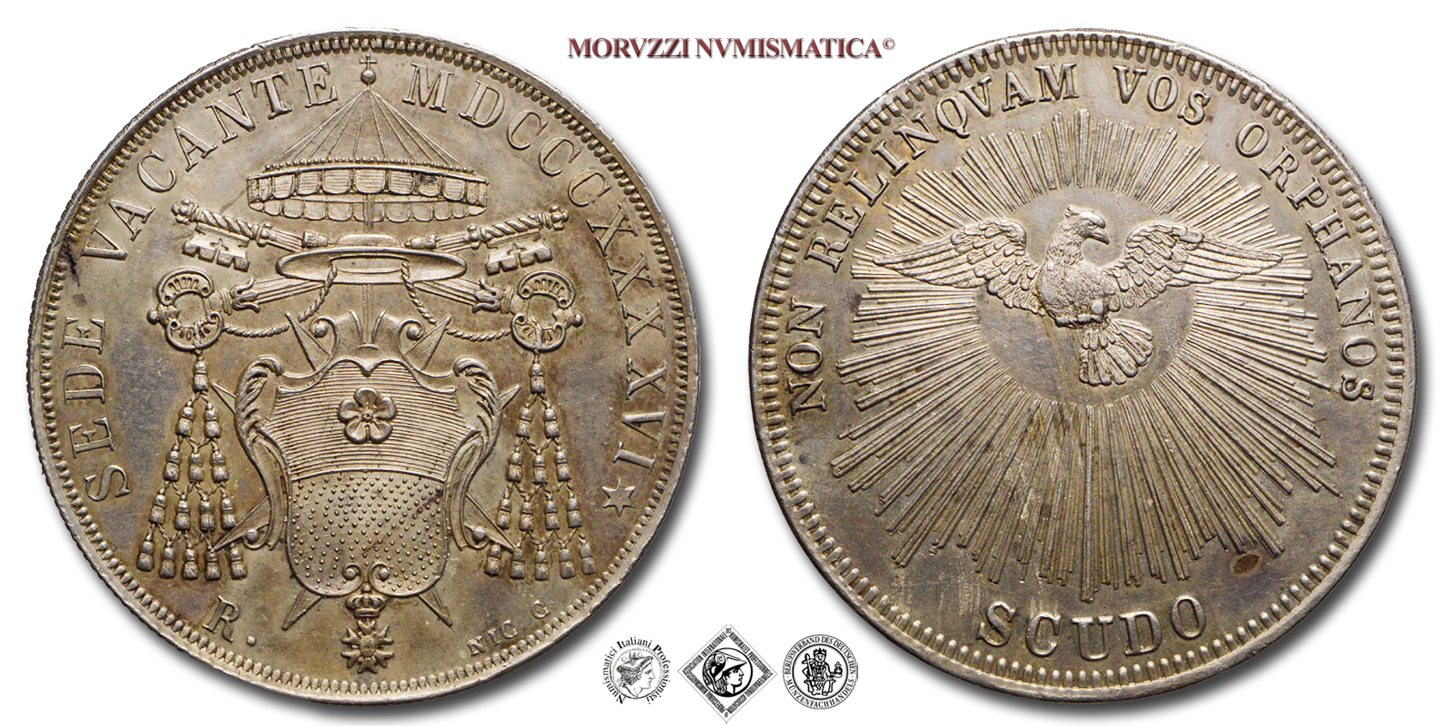 Stato Pontificio, SEDE VACANTE, 1846, SCUDO, Camerlengo Card. Tommaso Riario Sforza, Emissione: 1846, D/ SEDE VACANTE MDCCCXXXXVI (stella a sei punte), stemma Riario Sforza a targa sagomata sormontato da croce, galero, chiavi decussate, e padiglione. Sotto: il segno di zecca (R.) e le iniziali dell'incisore (NIC. C. per Nicola Cerbara), R/ NON RELINQVAM VOS ORPHANOS, colomba raggiante che vola di fronte con testa a destra; sotto: il valore (SCUDO), Zecca di Roma, Rif. bibl. Muntoni, 2; Pagani, 192; Metallo: AR, gr. 26,93, (MX28524), Diam.: mm. 37,66, mSPL, (R)